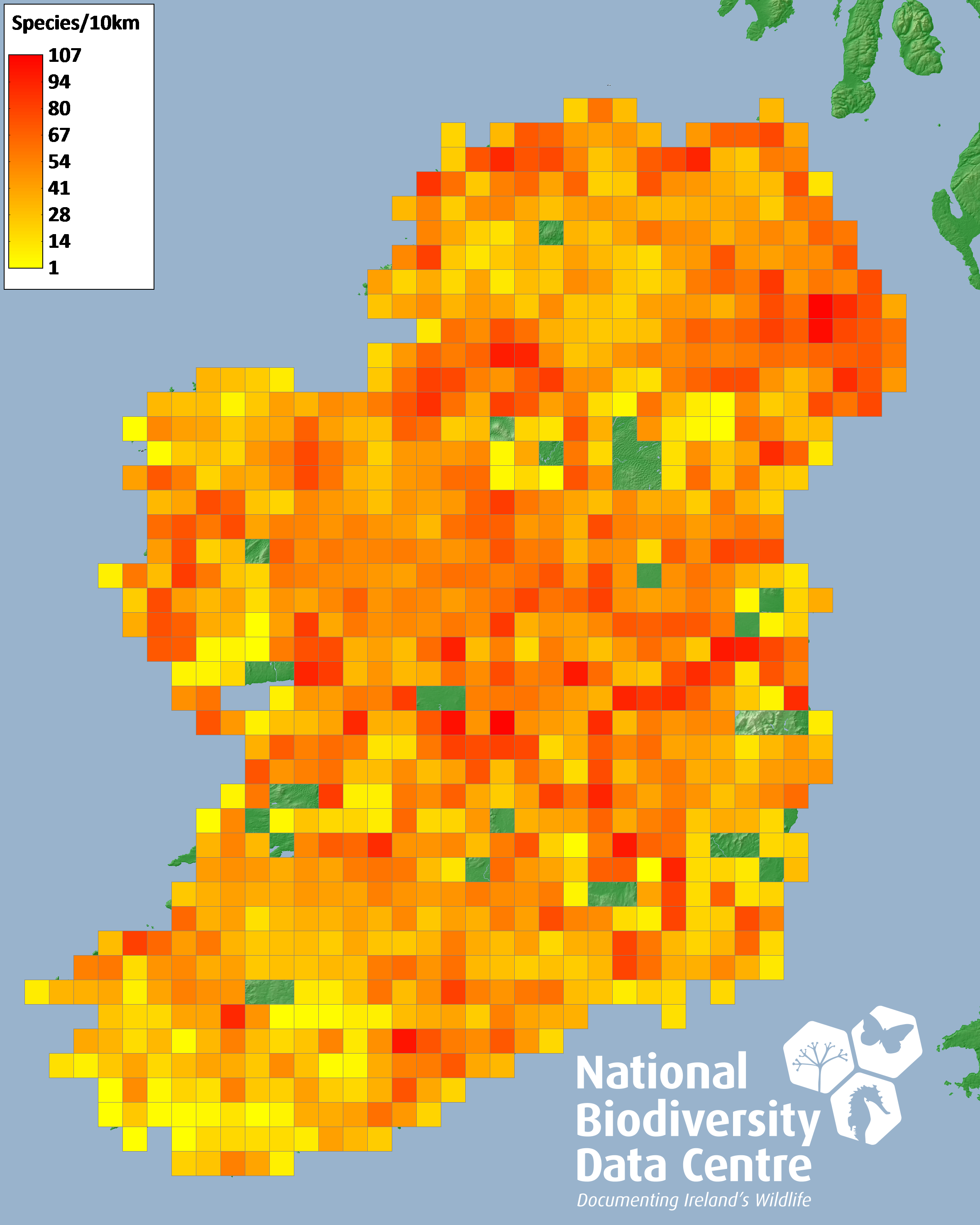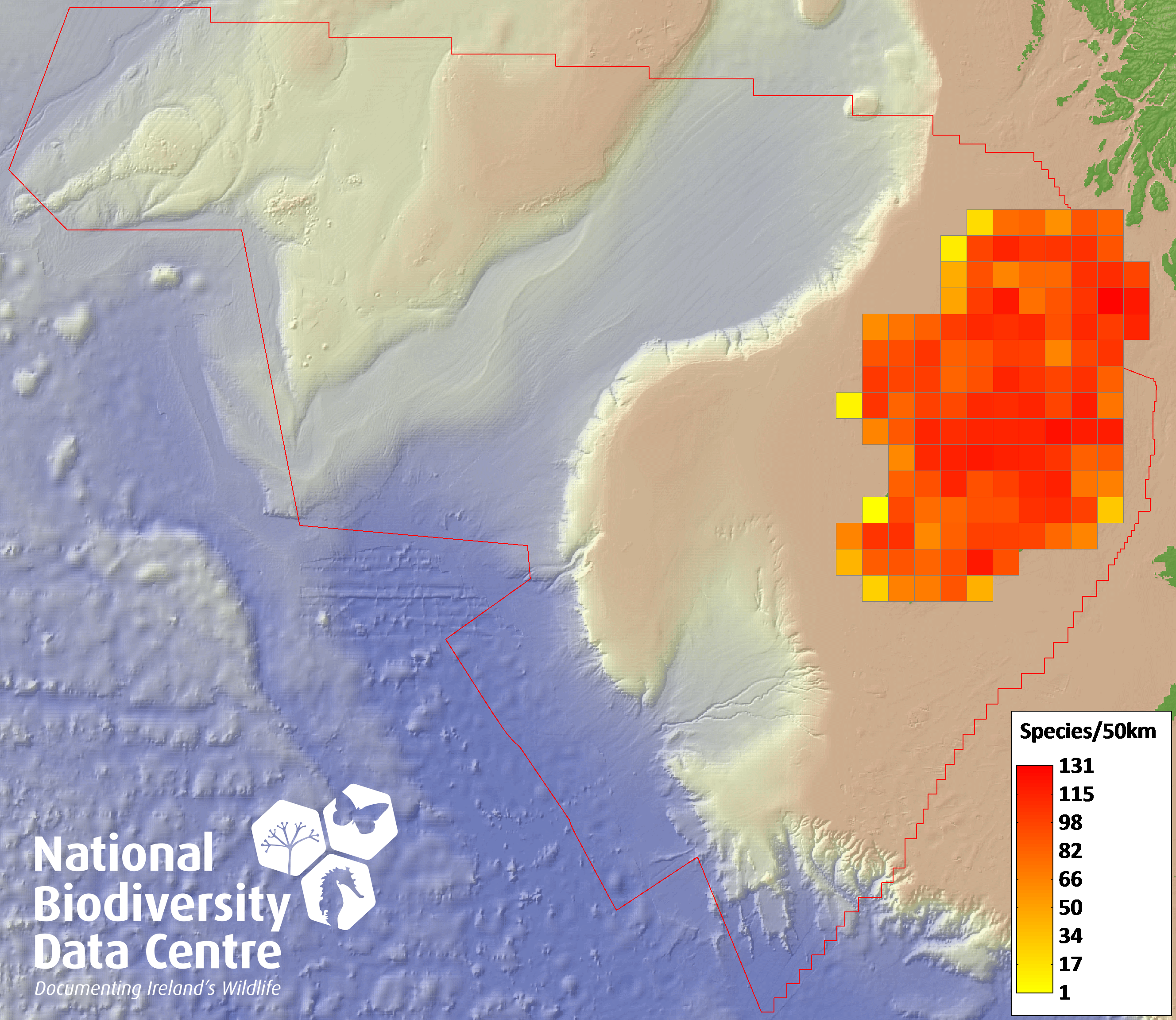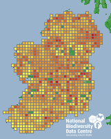 Distribution of the number of species recorded within each 10km grid square (ITM).Marine Map - 50Km