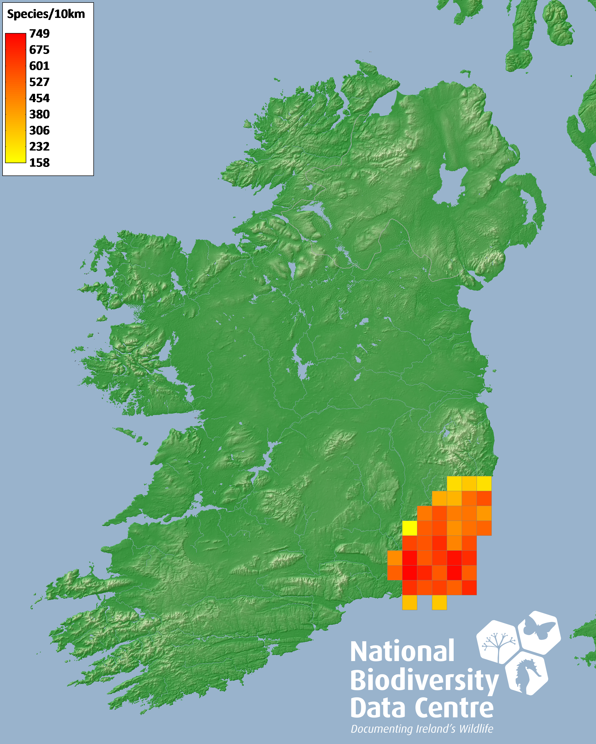 Distribution of the number of species recorded within each 10km grid square (ITM).Marine Map - 50Km