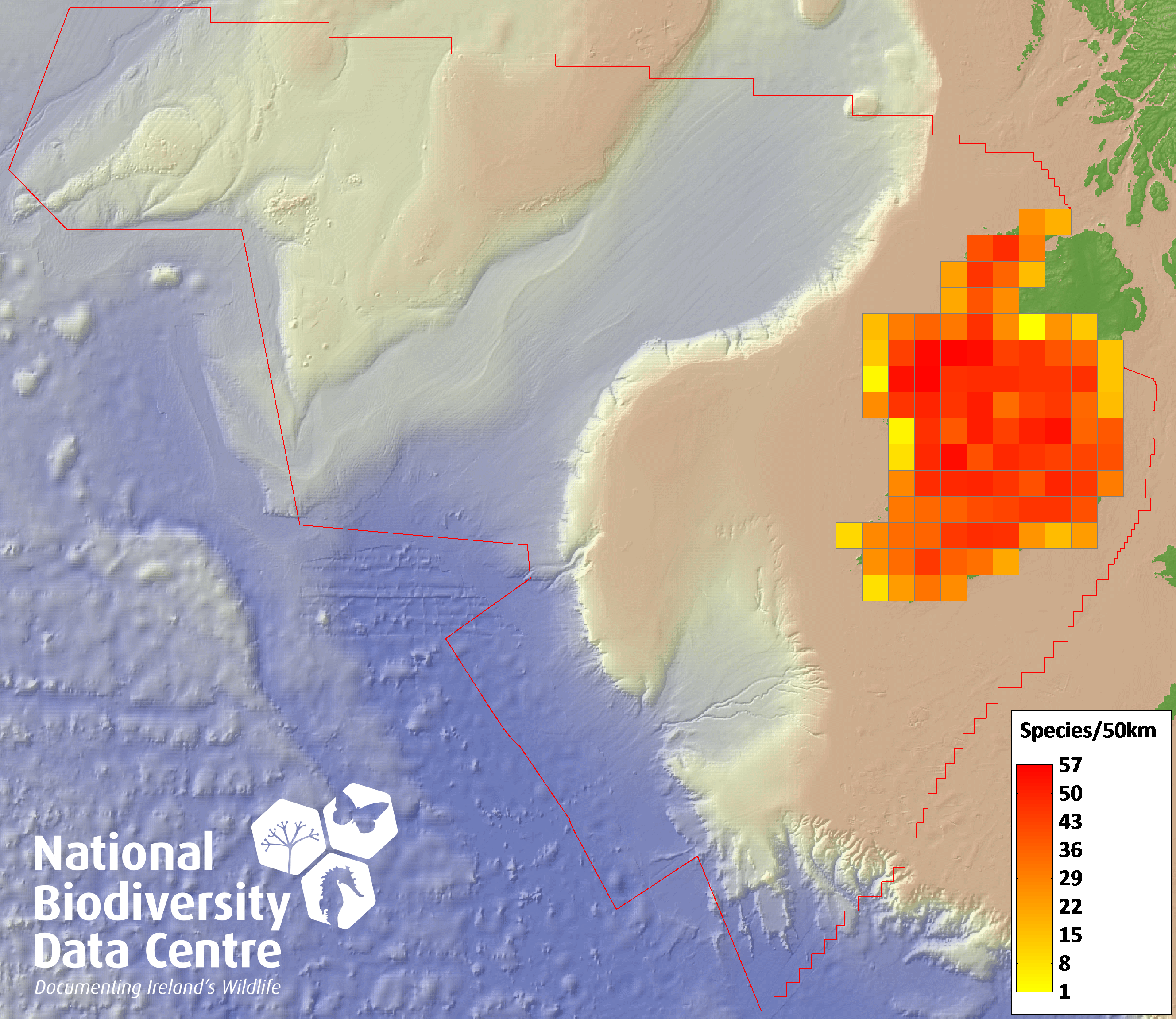 Distribution of the number of species recorded within each 10km grid square (ITM).Marine Map - 50Km