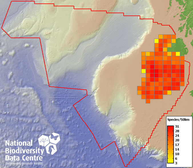 Distribution of the number of species recorded within each 10km grid square (ITM).Marine Map - 50Km