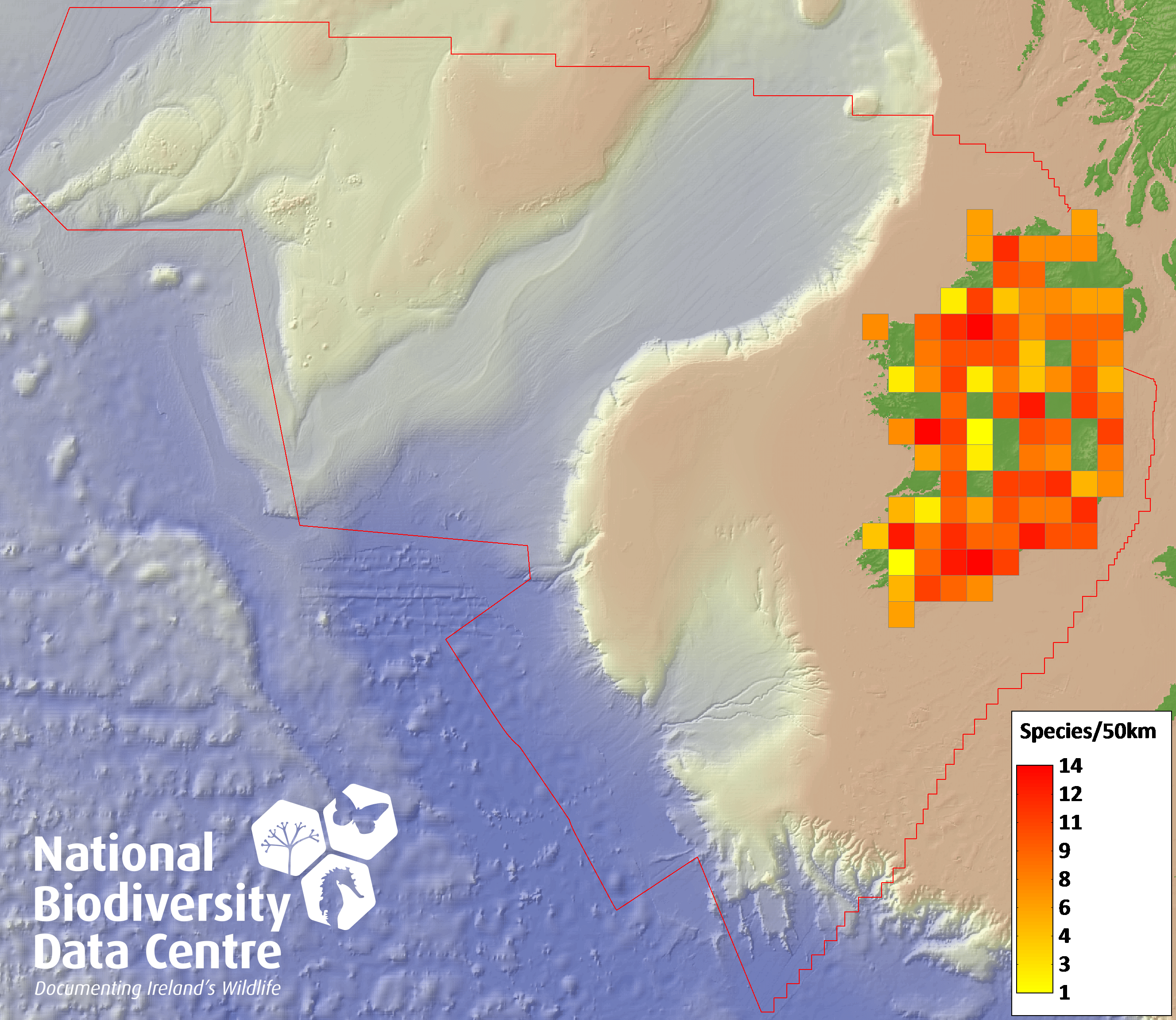 Distribution of the number of species recorded within each 10km grid square (ITM).Marine Map - 50Km