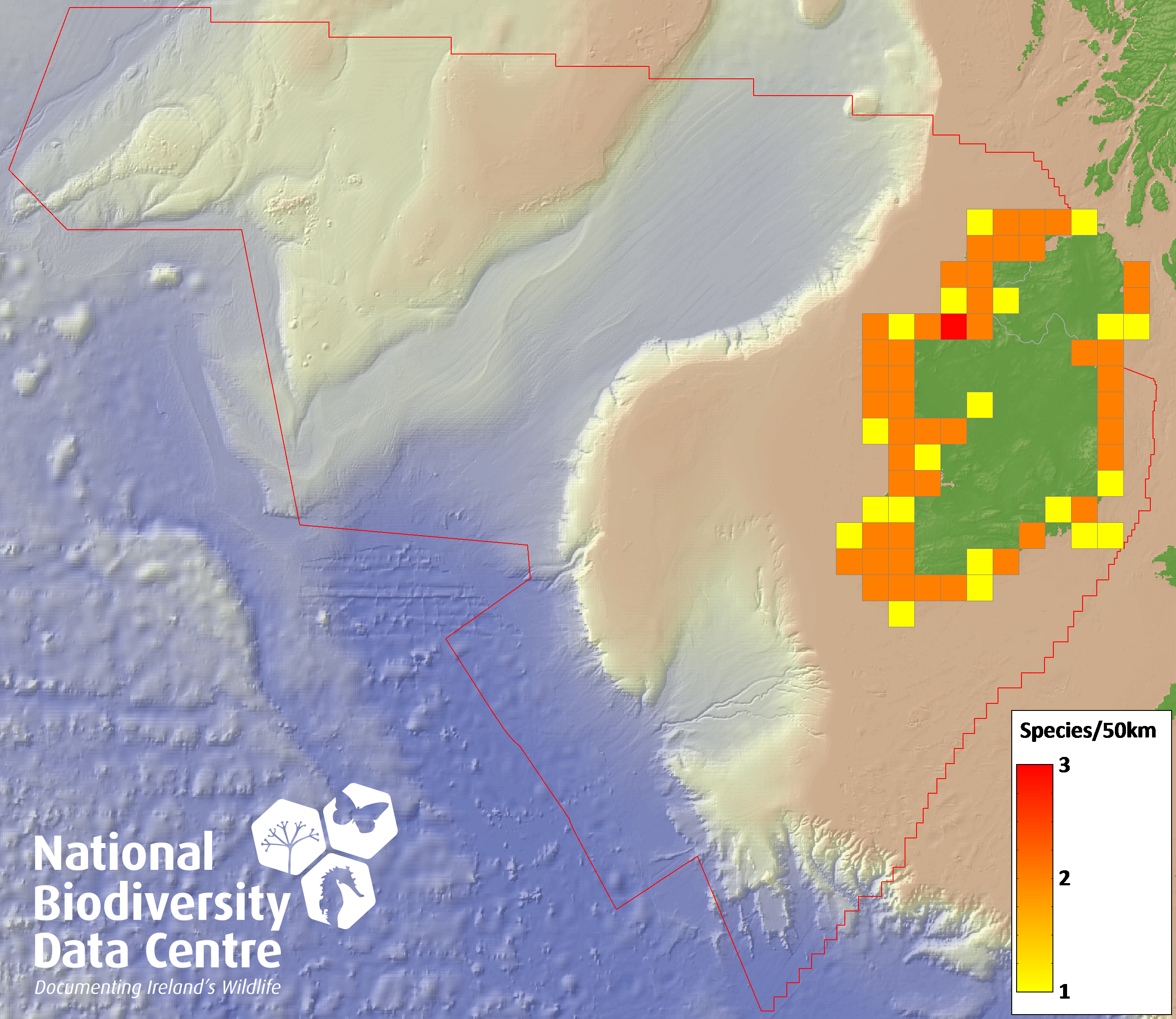 Distribution of the number of species recorded within each 10km grid square (ITM).Marine Map - 50Km