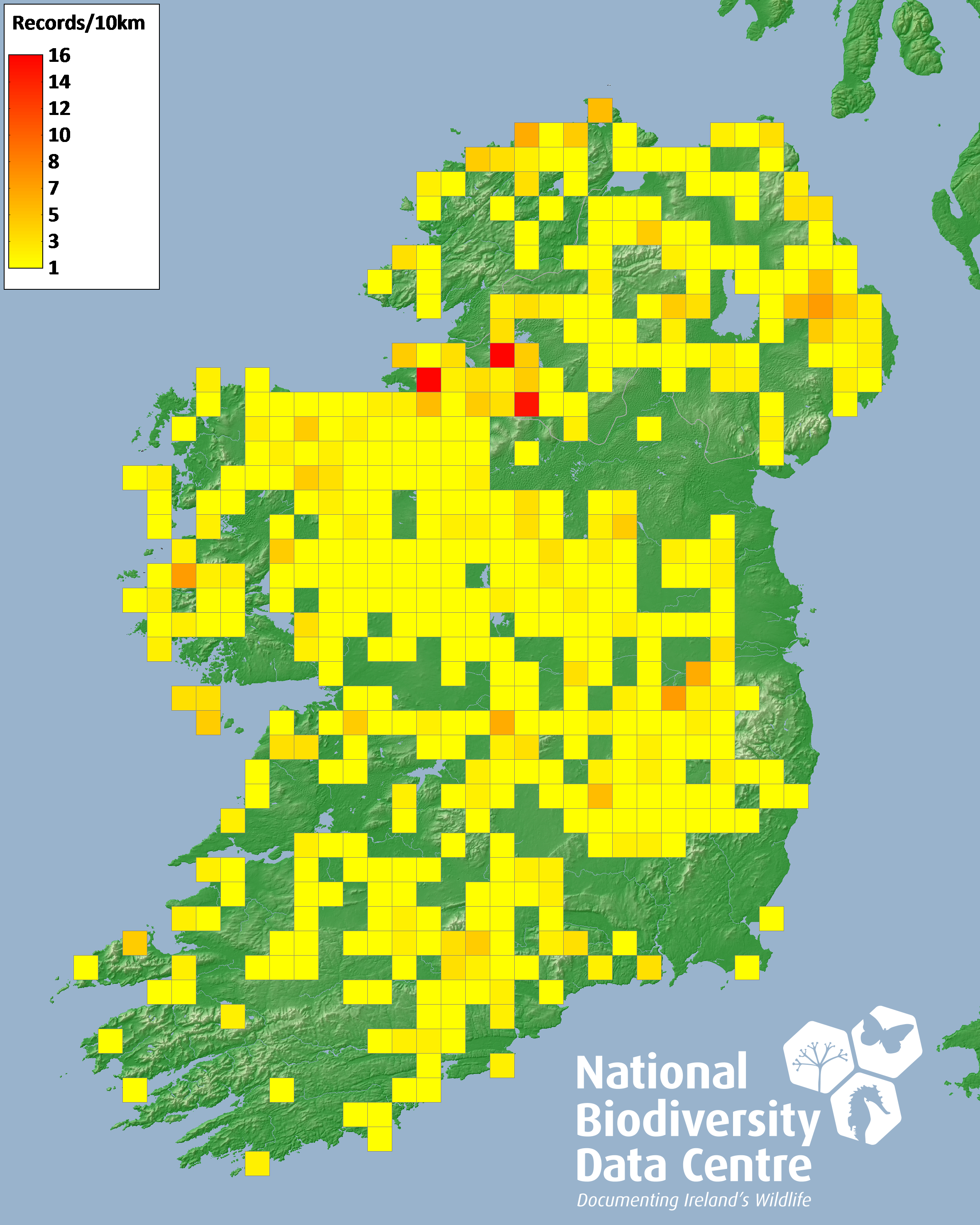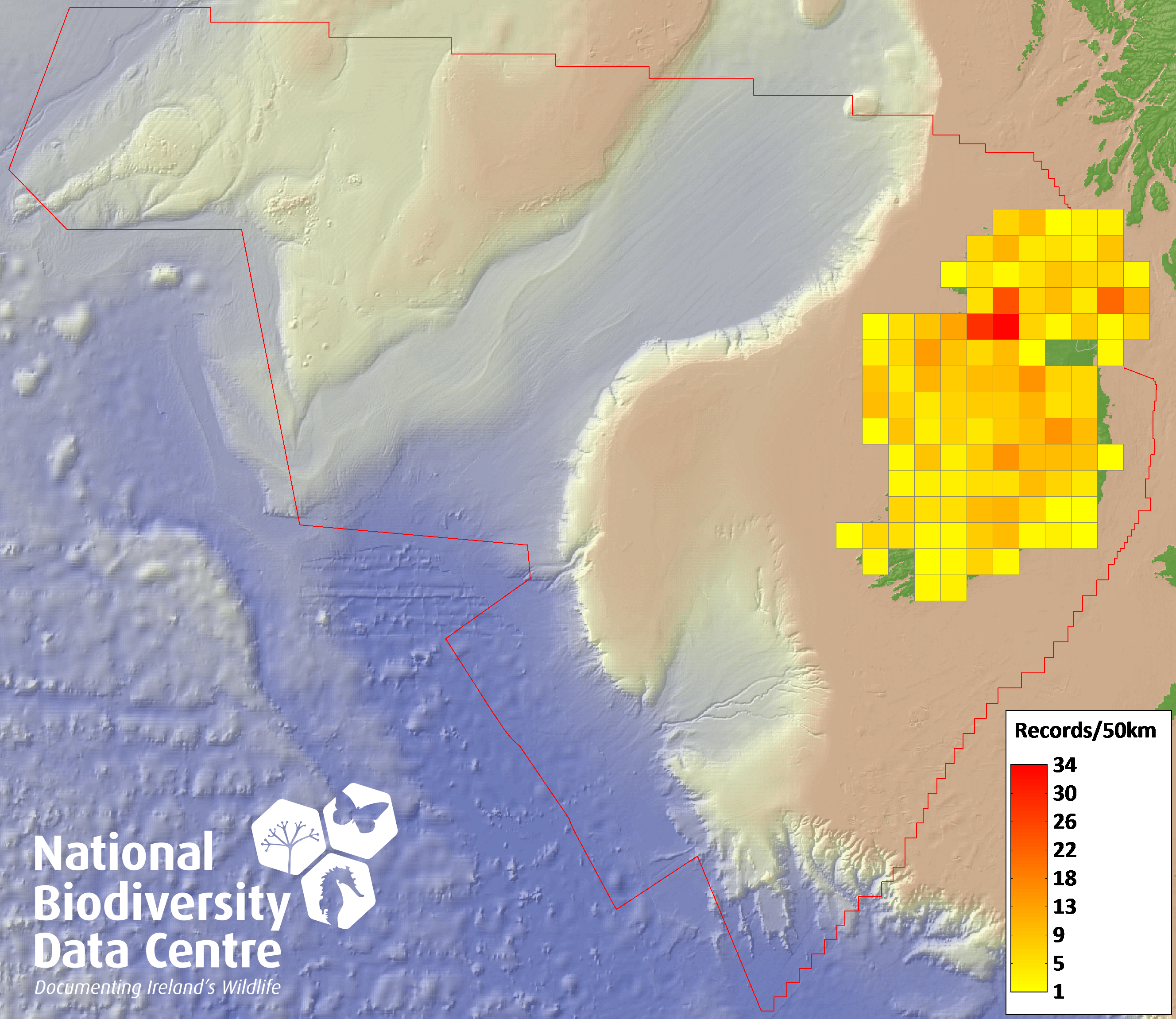 Distribution of the number of records recorded within each 10km grid square (ITM).Marine Map - 50km