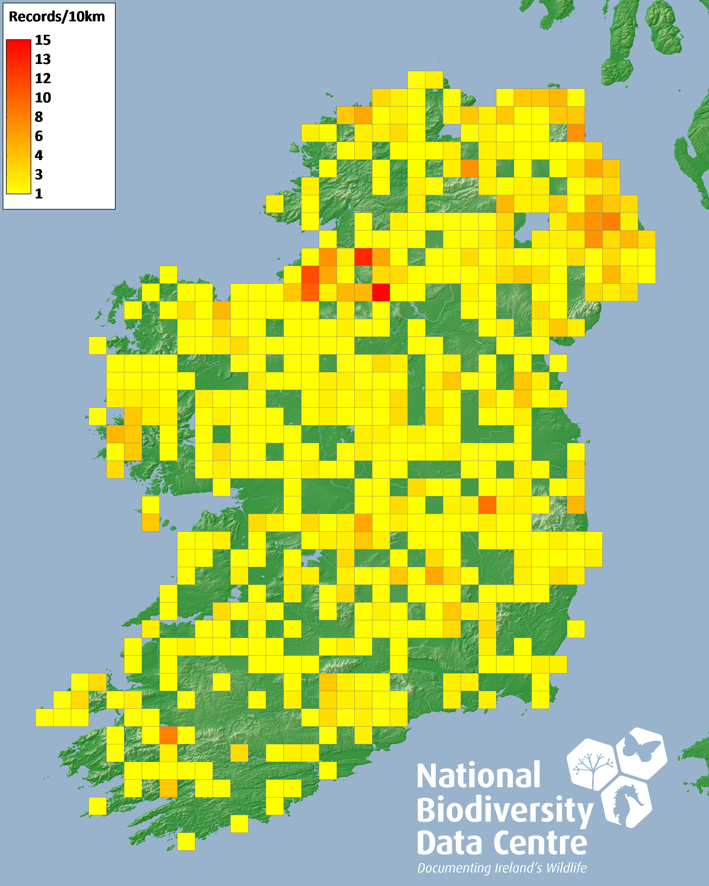Distribution of the number of records recorded within each 10km grid square (ITM).Marine Map - 50km