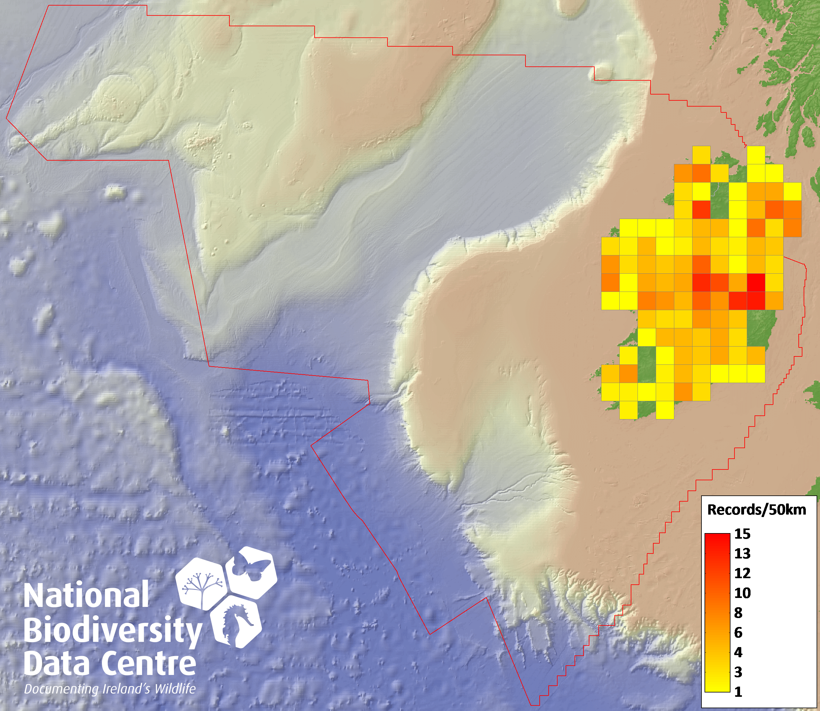 Distribution of the number of records recorded within each 10km grid square (ITM).Marine Map - 50km