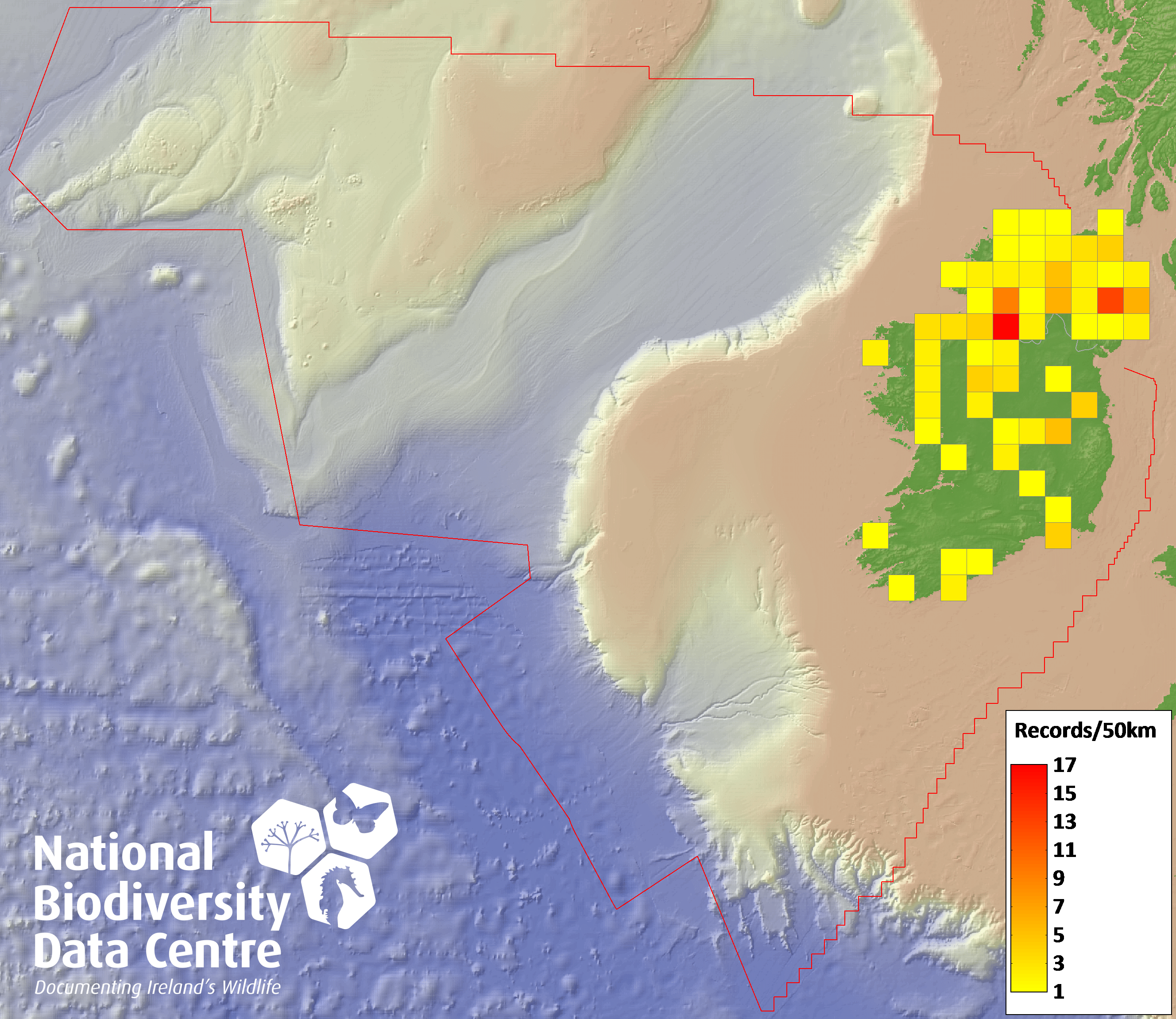 Distribution of the number of records recorded within each 10km grid square (ITM).Marine Map - 50km