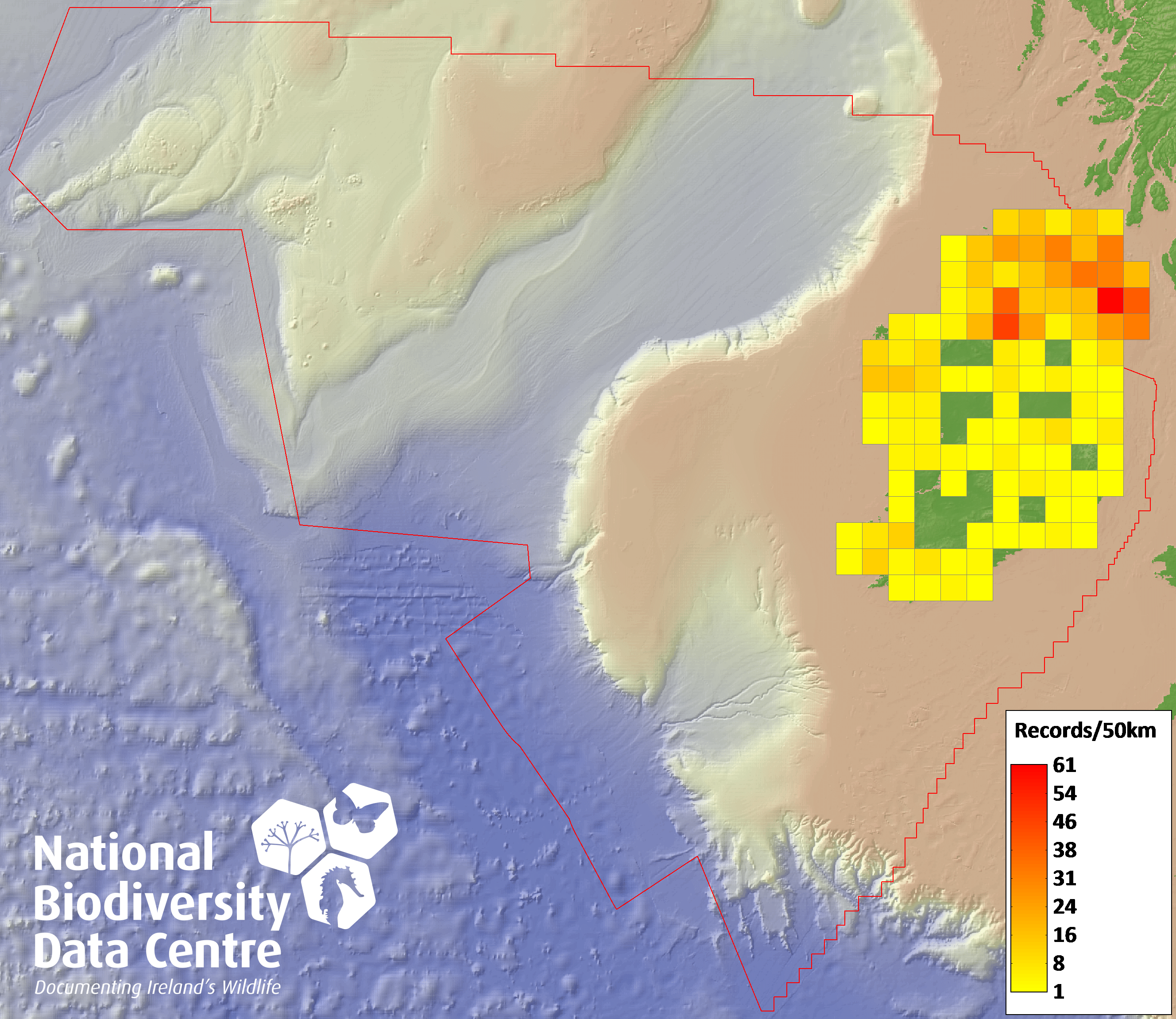 Distribution of the number of records recorded within each 10km grid square (ITM).Marine Map - 50km