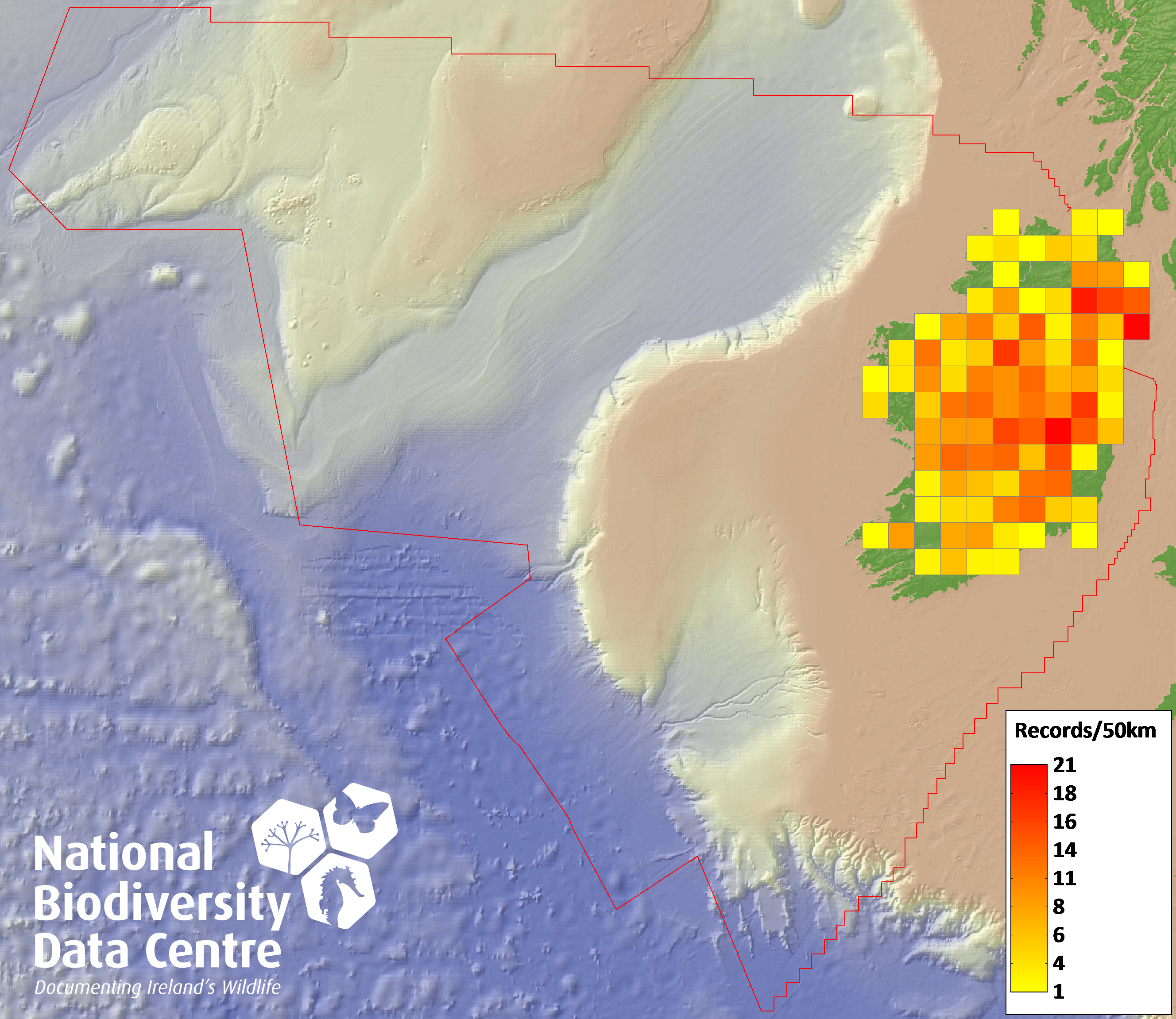 Distribution of the number of records recorded within each 10km grid square (ITM).Marine Map - 50km