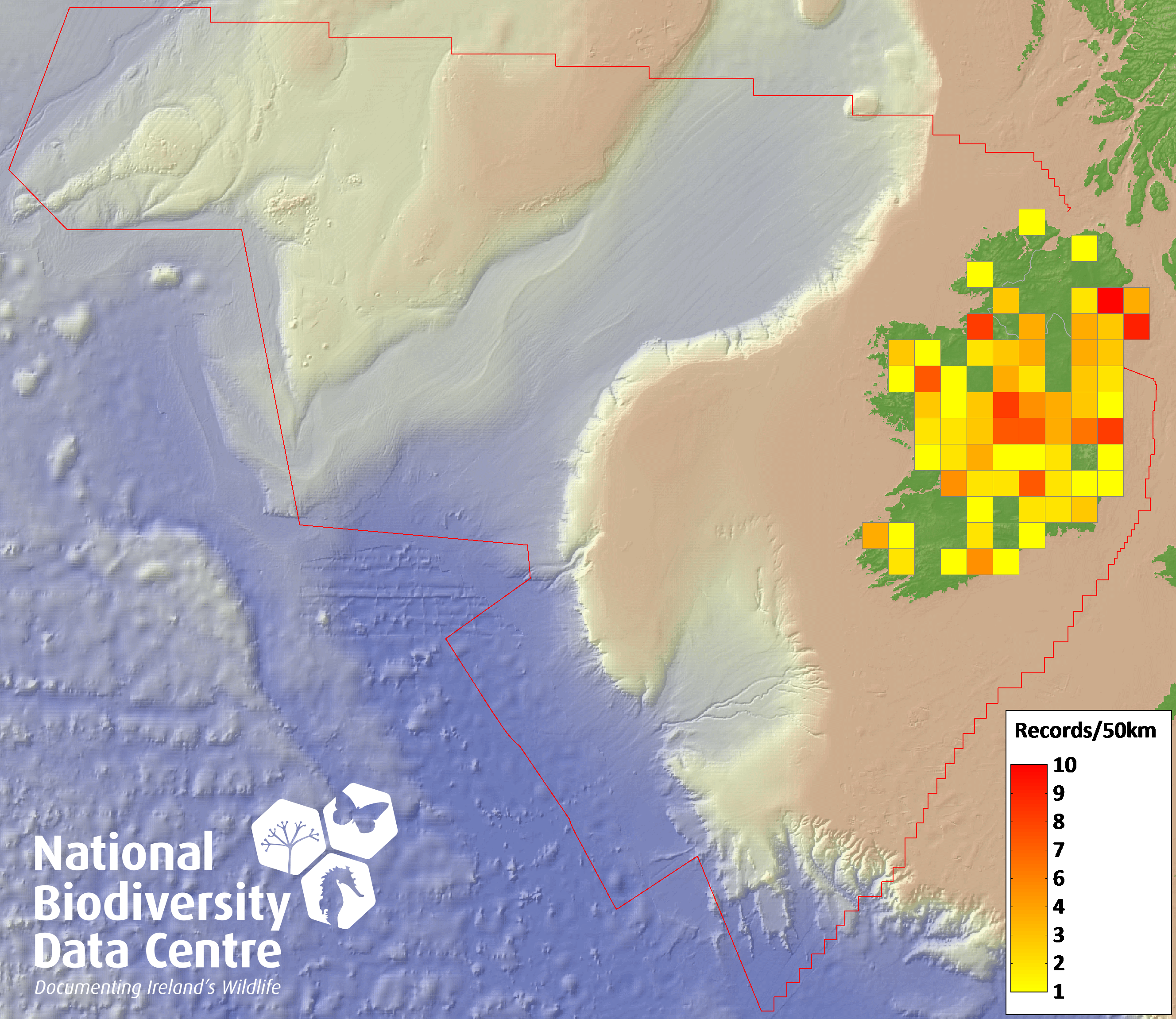 Distribution of the number of records recorded within each 10km grid square (ITM).Marine Map - 50km