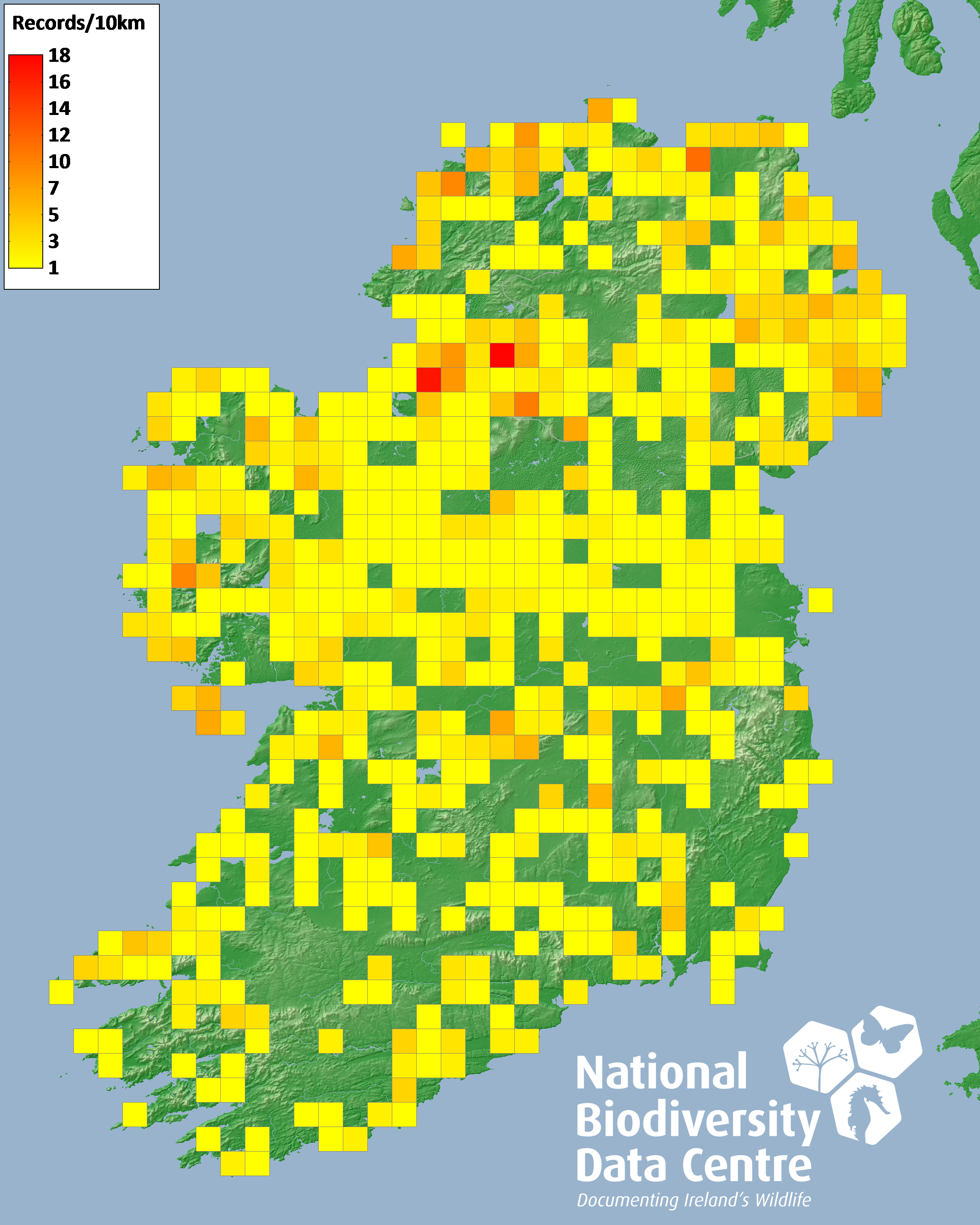 Distribution of the number of records recorded within each 10km grid square (ITM).Marine Map - 50km