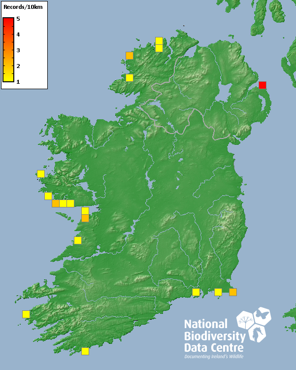 Distribution of the number of records recorded within each 10km grid square (ITM).Marine Map - 50km