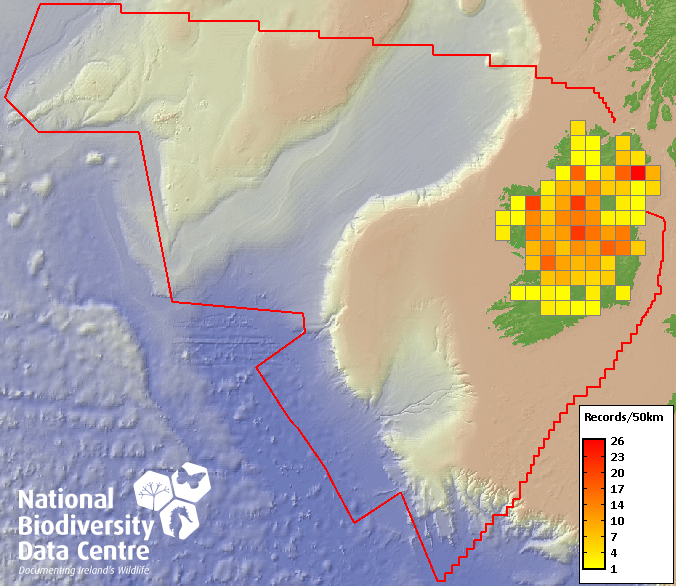 Distribution of the number of records recorded within each 10km grid square (ITM).Marine Map - 50km