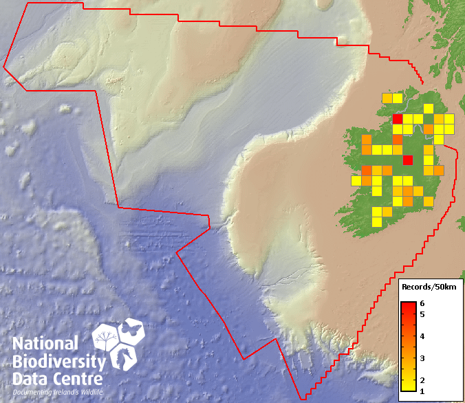 Distribution of the number of records recorded within each 10km grid square (ITM).Marine Map - 50km