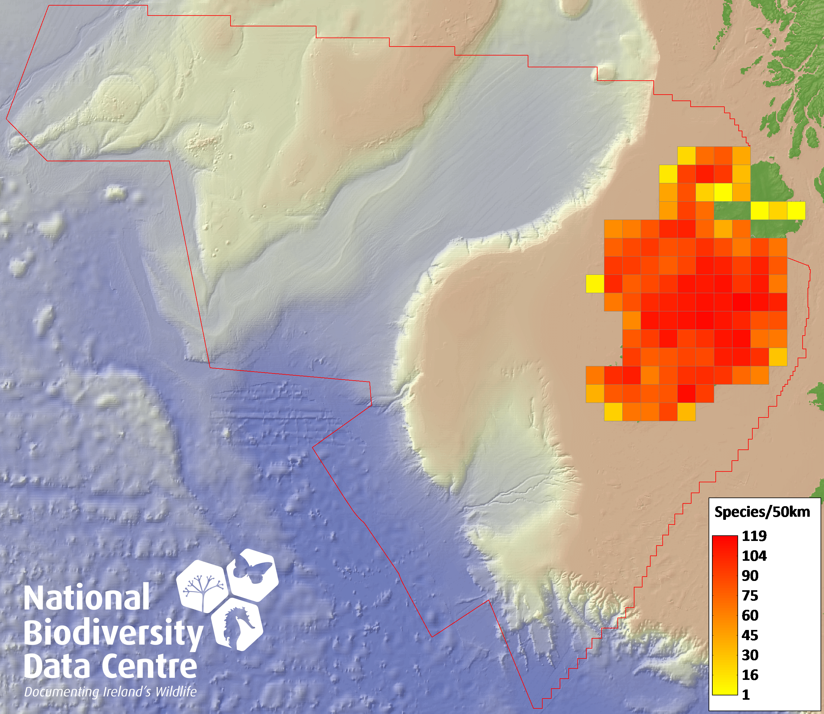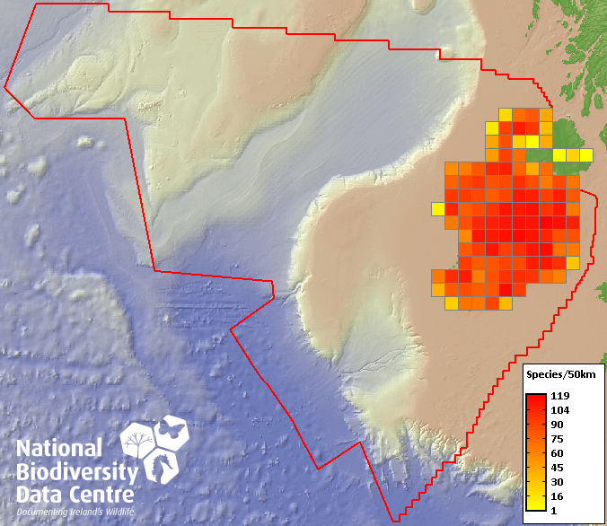 Distribution of the number of species recorded within each 10km grid square (ITM).Marine Map - 50Km
