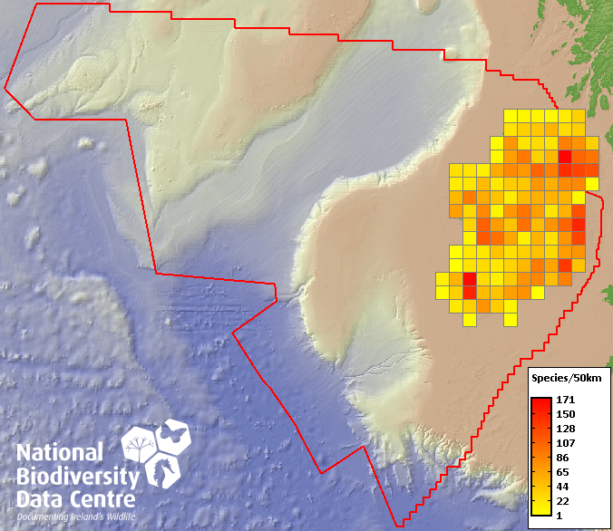 Distribution of the number of species recorded within each 10km grid square (ITM).Marine Map - 50Km