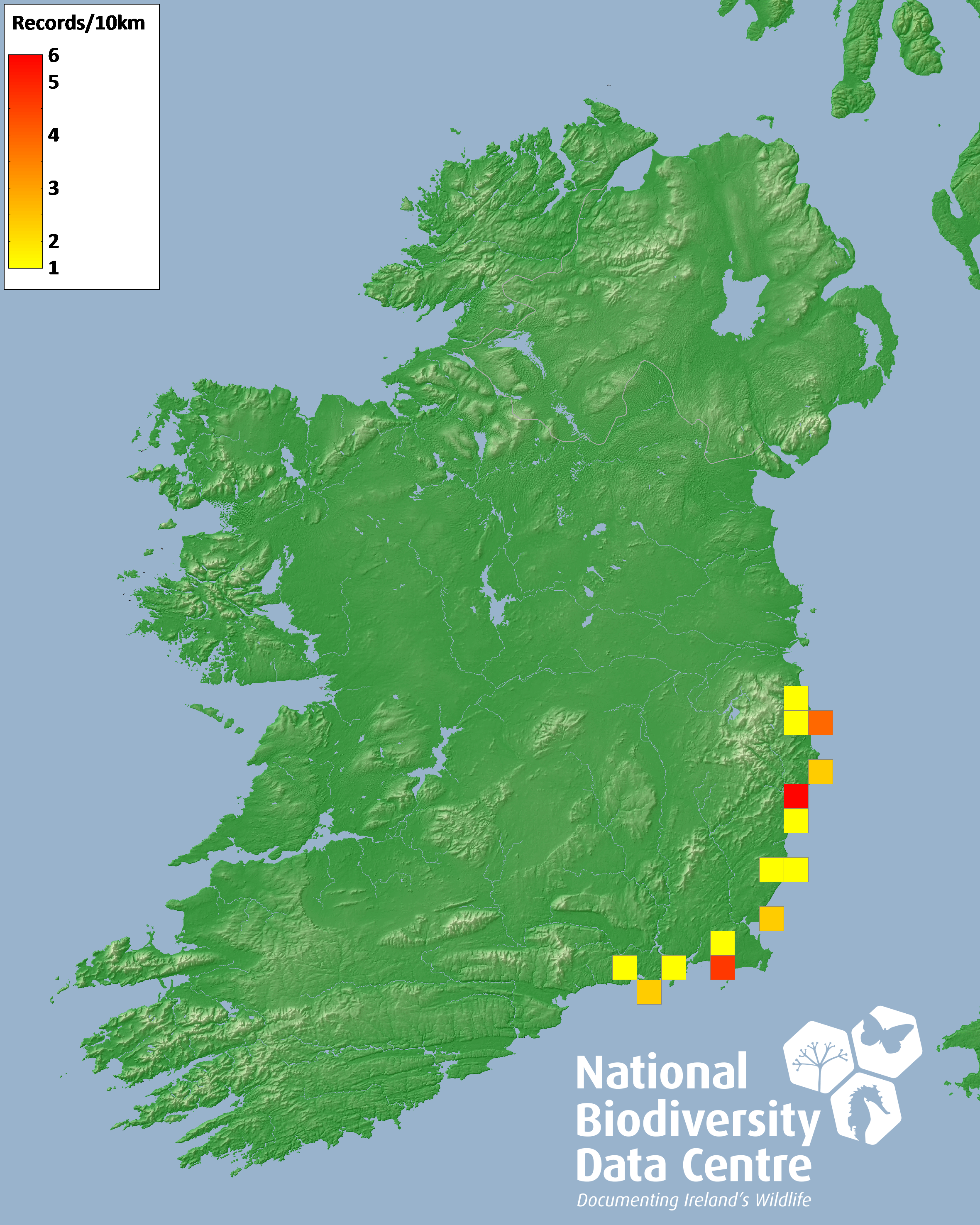 Distribution of the number of records recorded within each 10km grid square (ITM).Marine Map - 50km