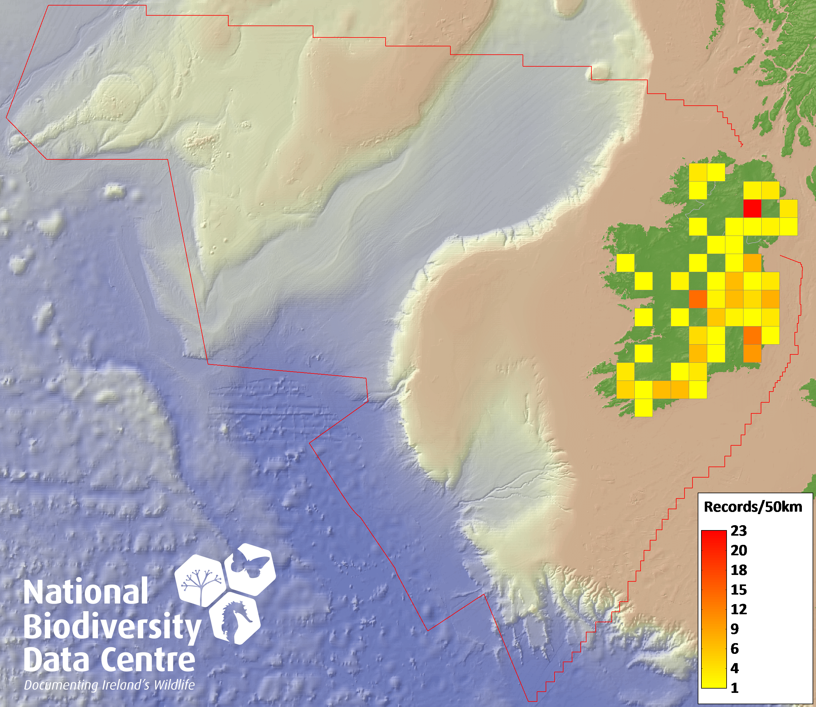 Distribution of the number of records recorded within each 10km grid square (ITM).Marine Map - 50km