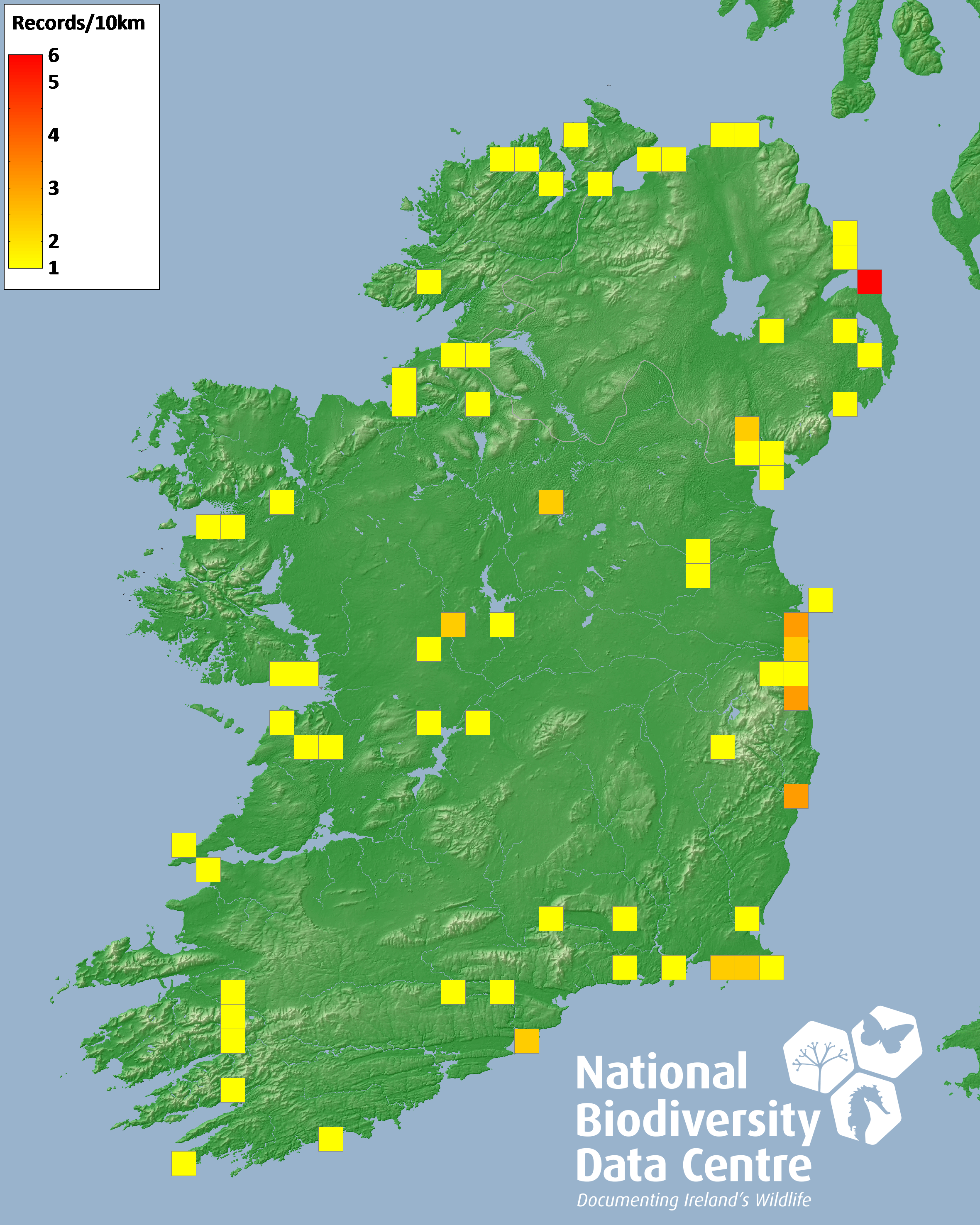 Distribution of the number of records recorded within each 10km grid square (ITM).Marine Map - 50km