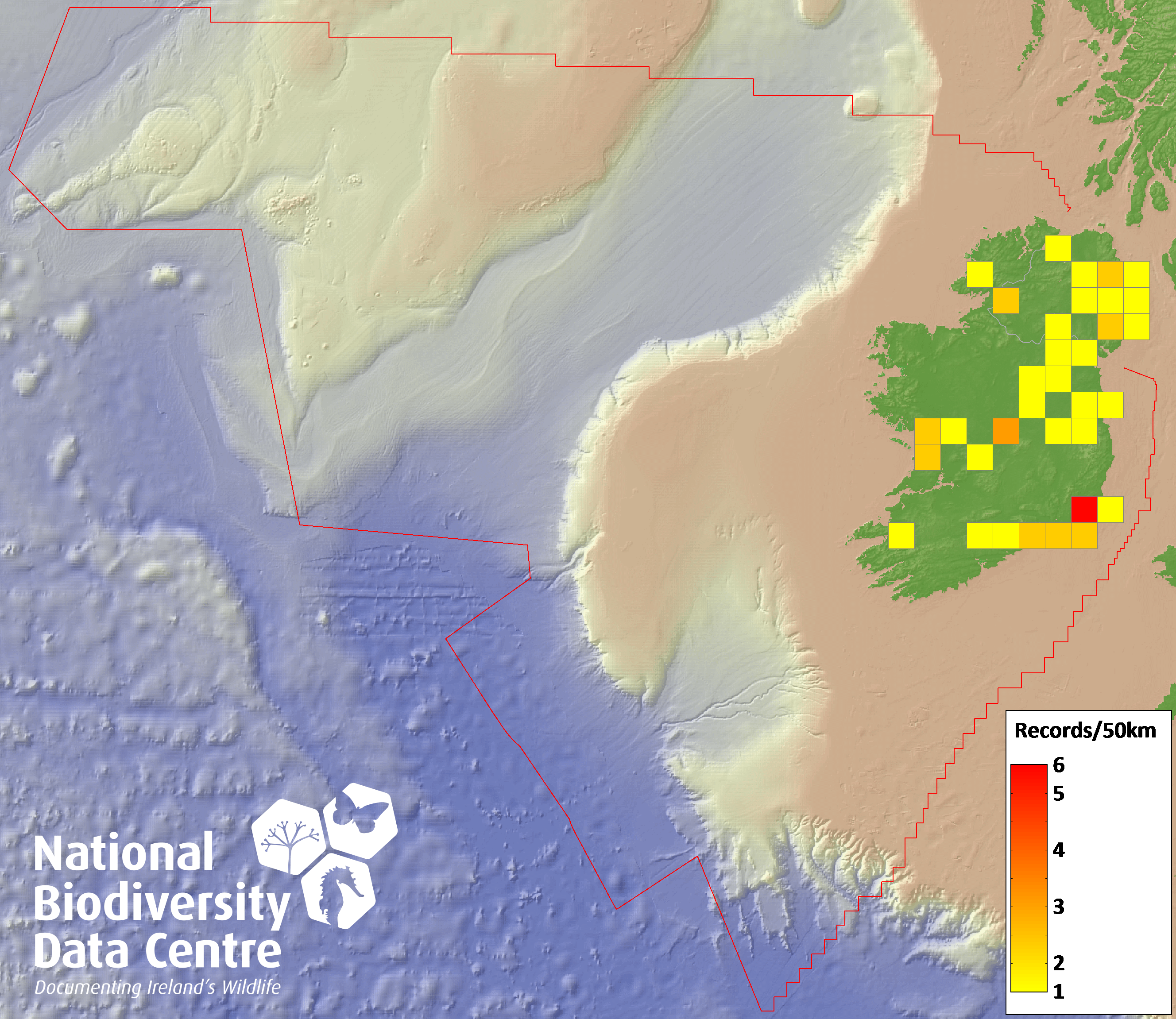 Distribution of the number of records recorded within each 10km grid square (ITM).Marine Map - 50km