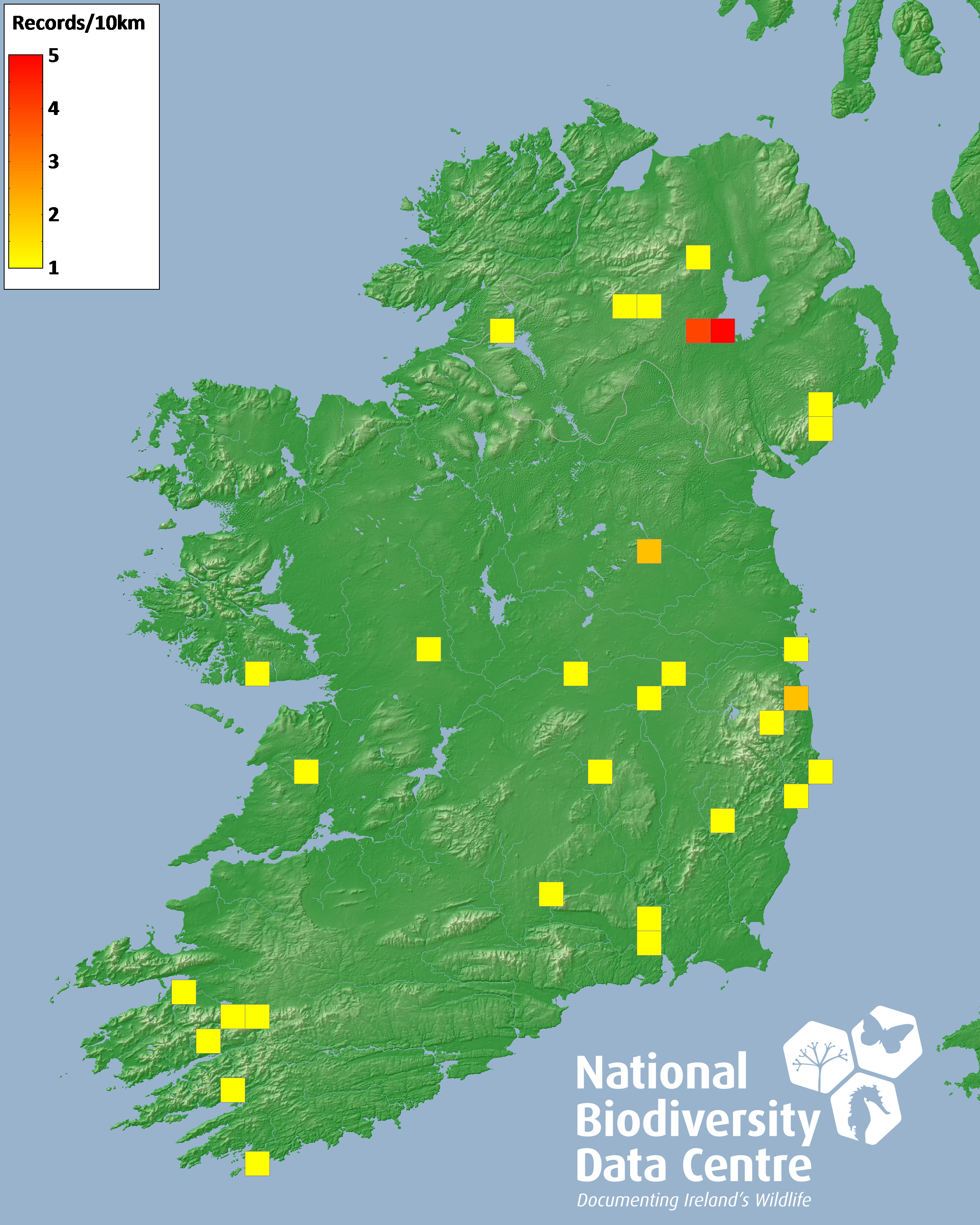 Distribution of the number of records recorded within each 10km grid square (ITM).Marine Map - 50km