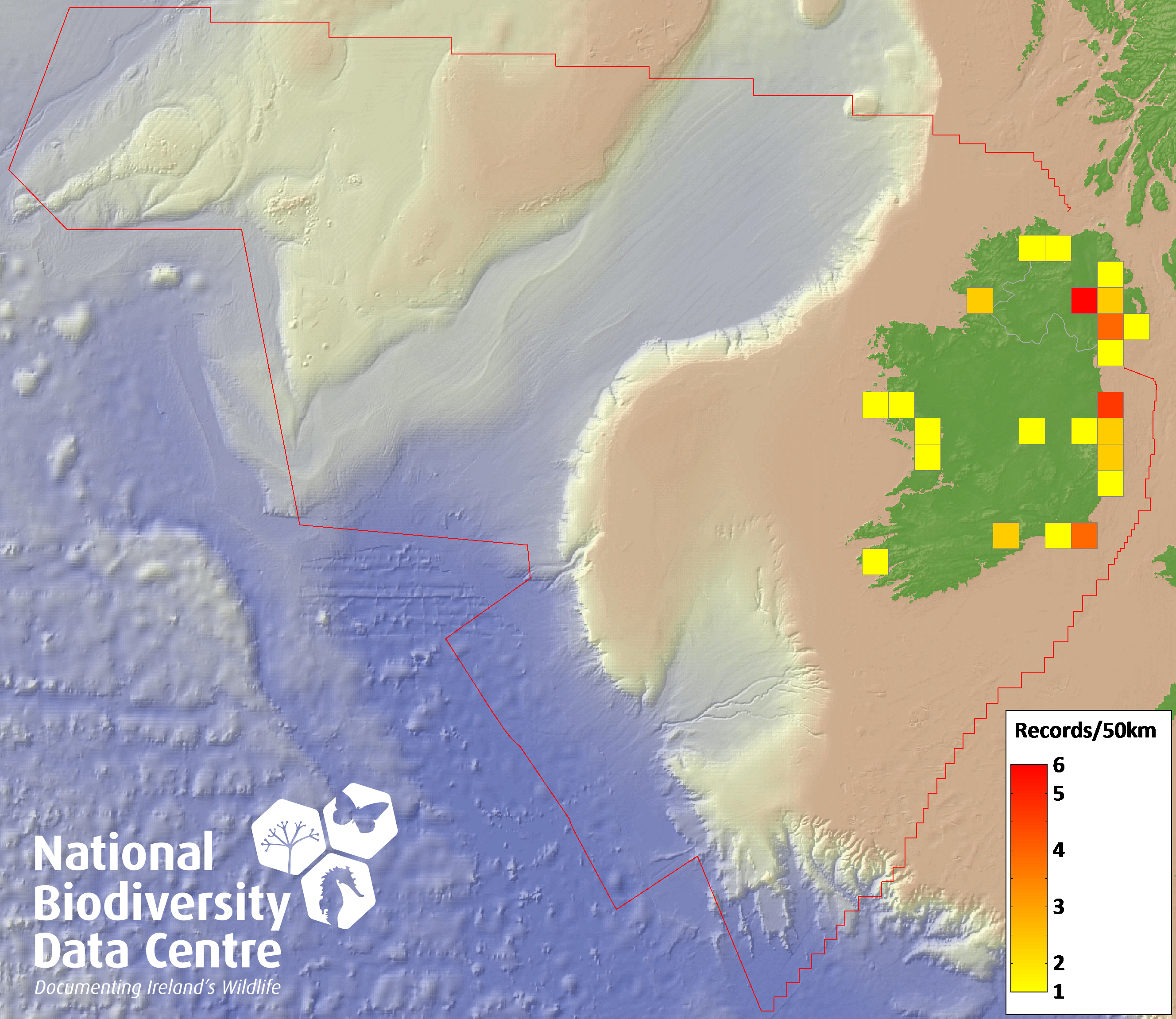 Distribution of the number of records recorded within each 10km grid square (ITM).Marine Map - 50km