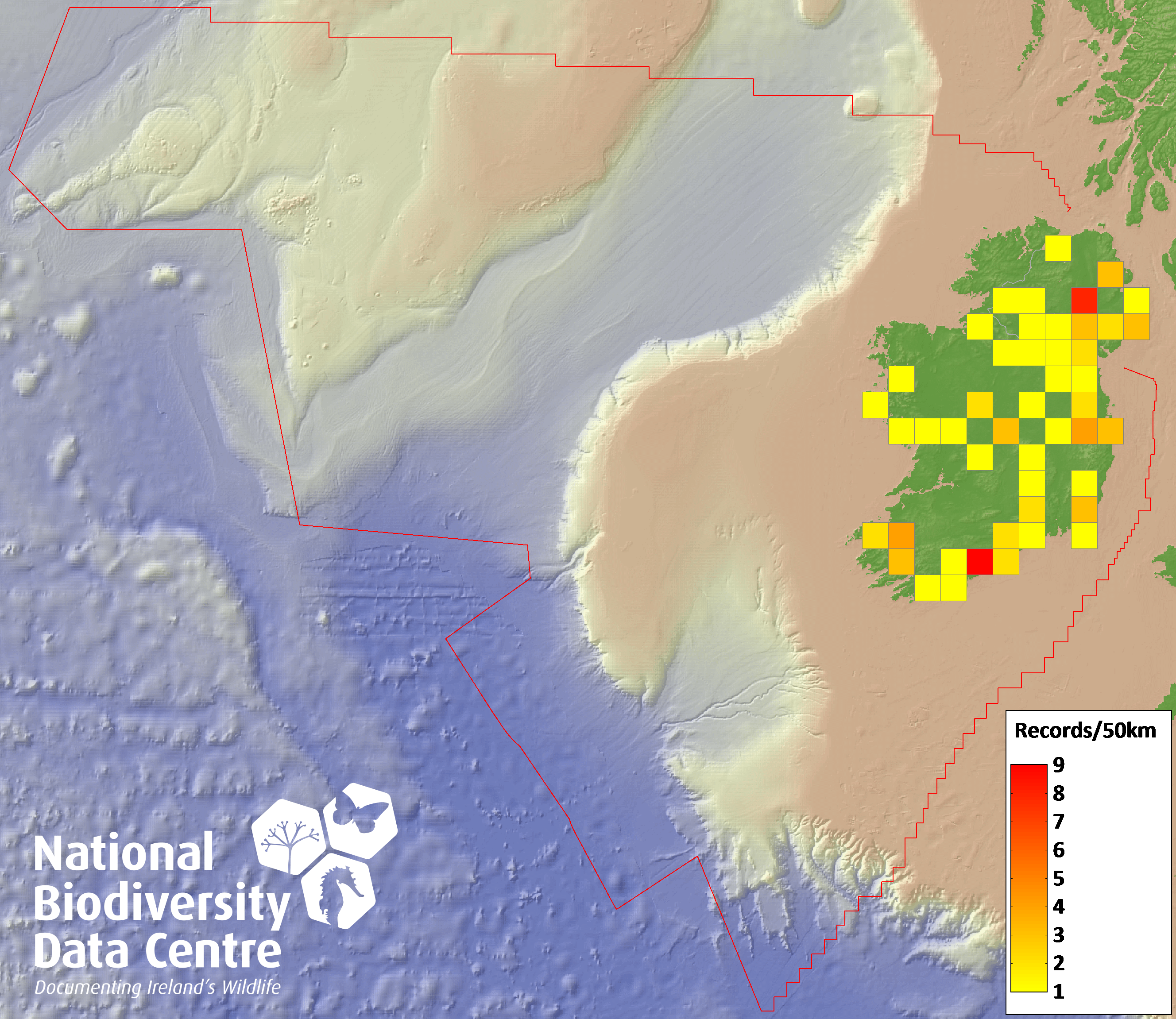Distribution of the number of records recorded within each 10km grid square (ITM).Marine Map - 50km