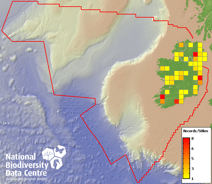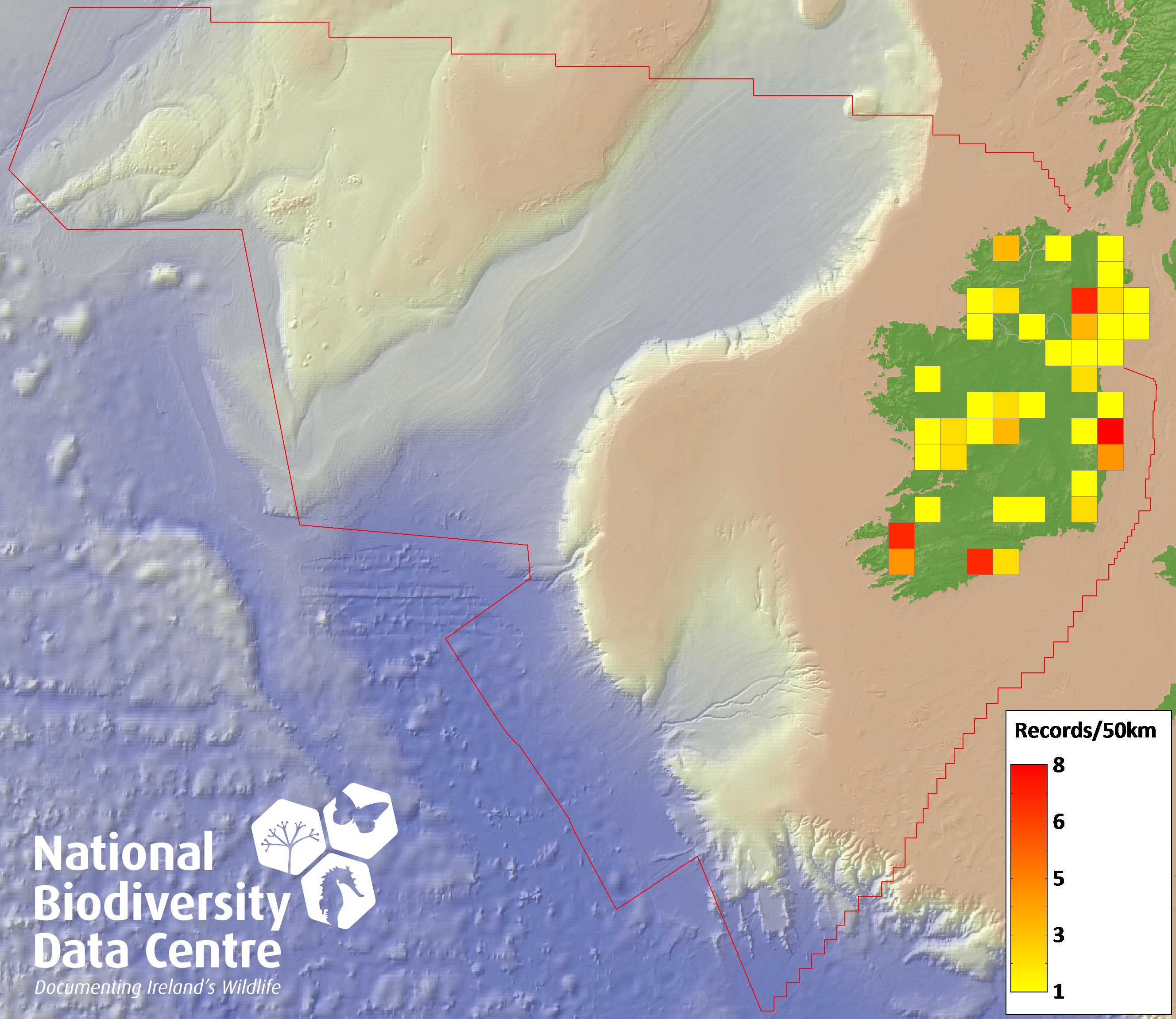 Distribution of the number of records recorded within each 10km grid square (ITM).Marine Map - 50km