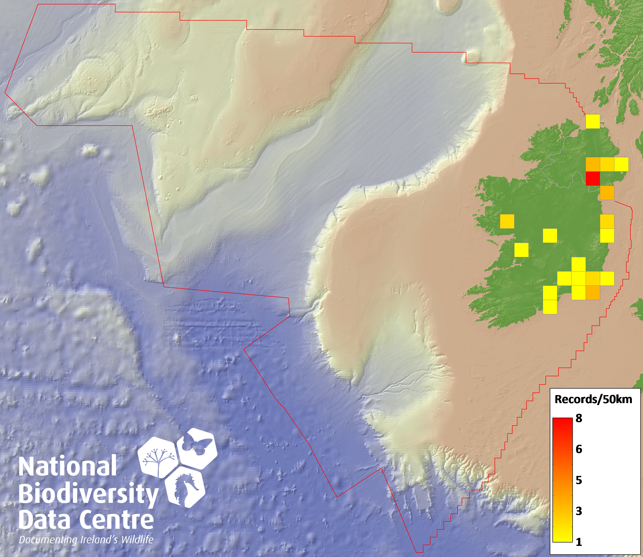 Distribution of the number of records recorded within each 10km grid square (ITM).Marine Map - 50km