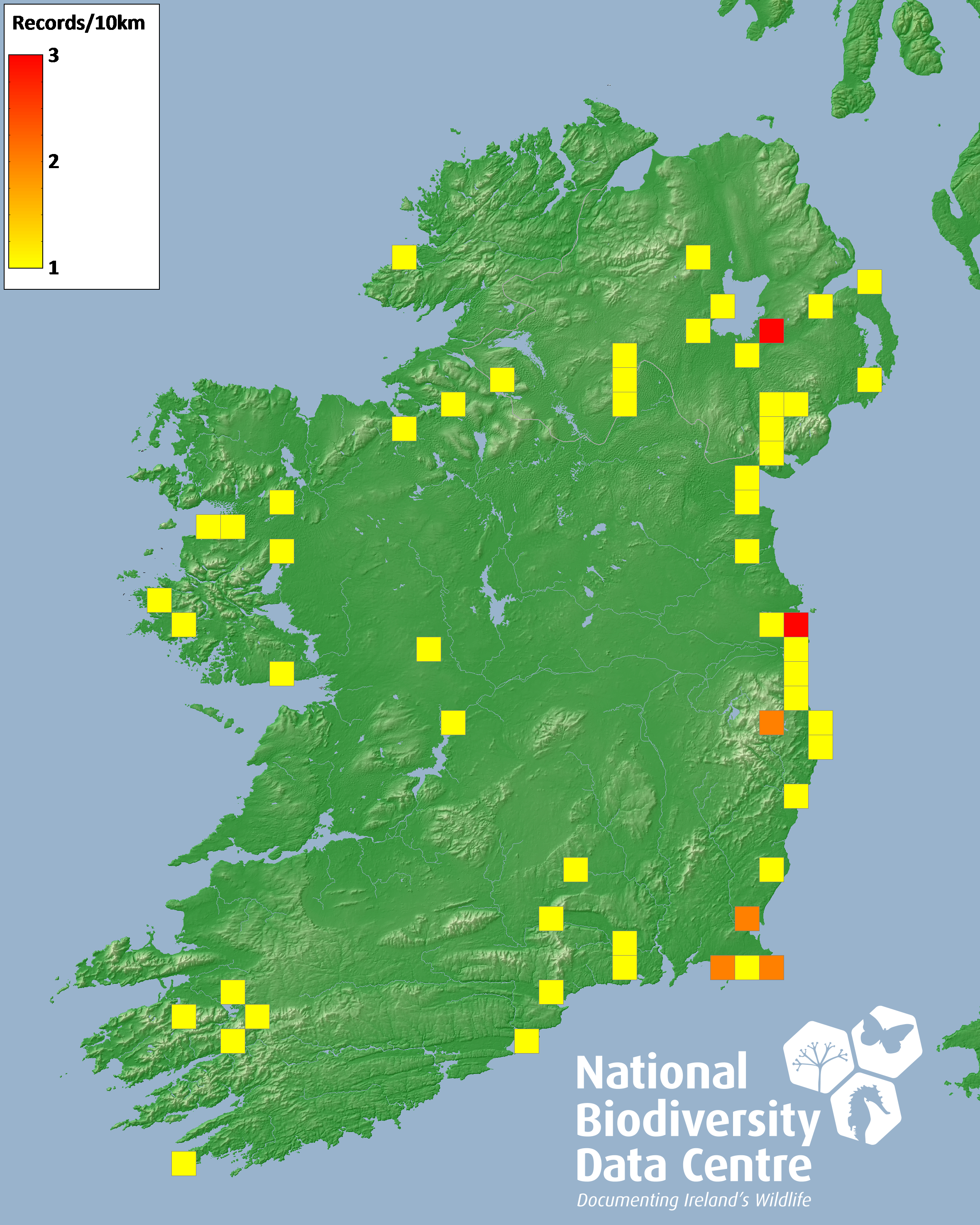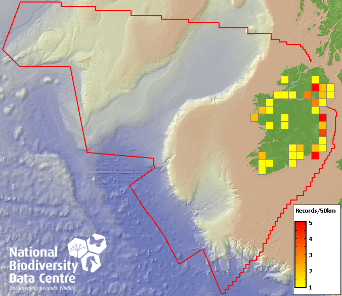 Distribution of the number of records recorded within each 10km grid square (ITM).Marine Map - 50km