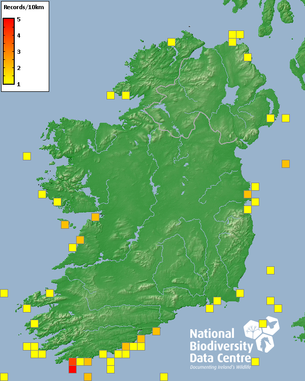 Distribution of the number of records recorded within each 10km grid square (ITM).Marine Map - 50km