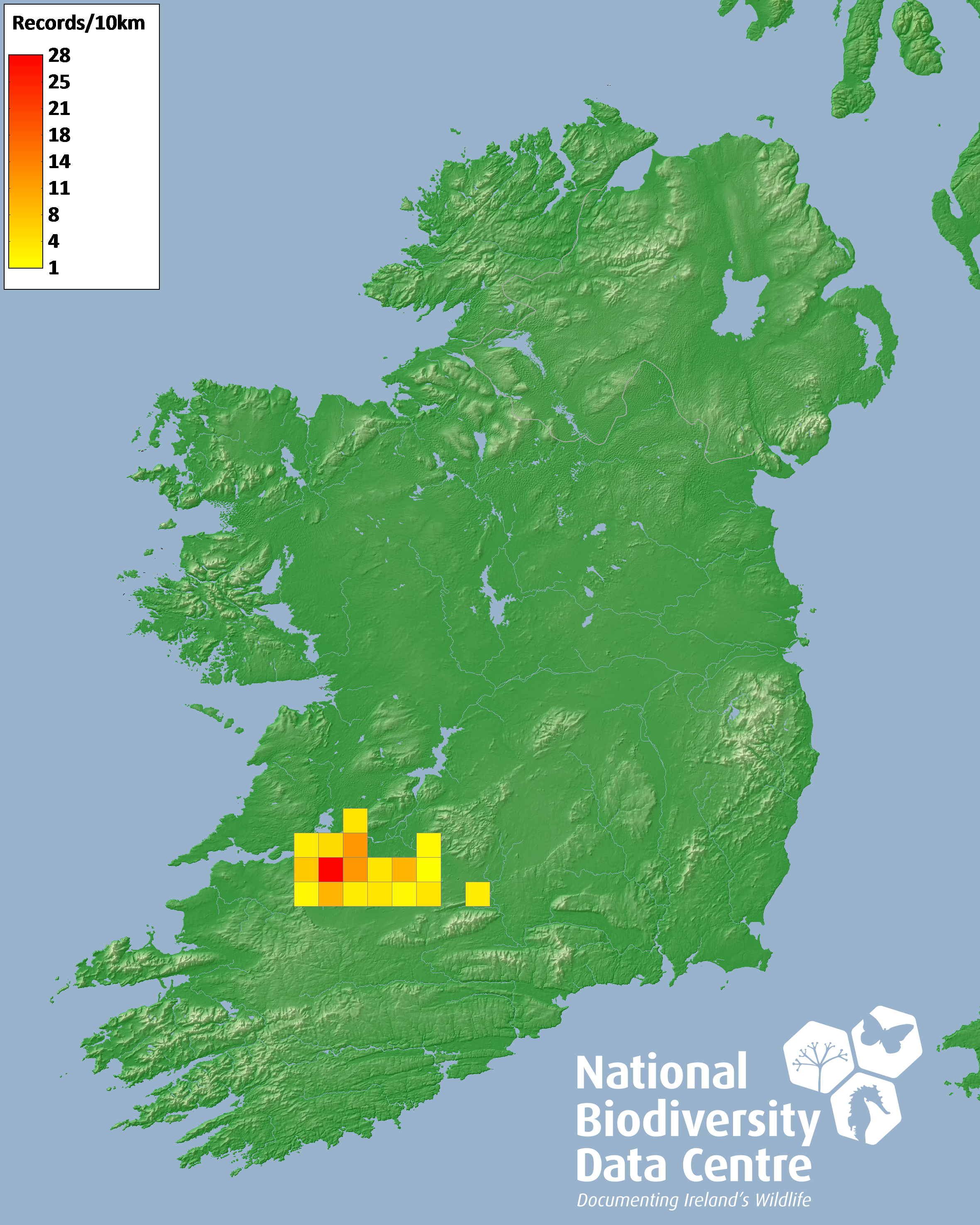 Distribution of the number of records within each 10km grid square (ITM).Marine Map - 50Km