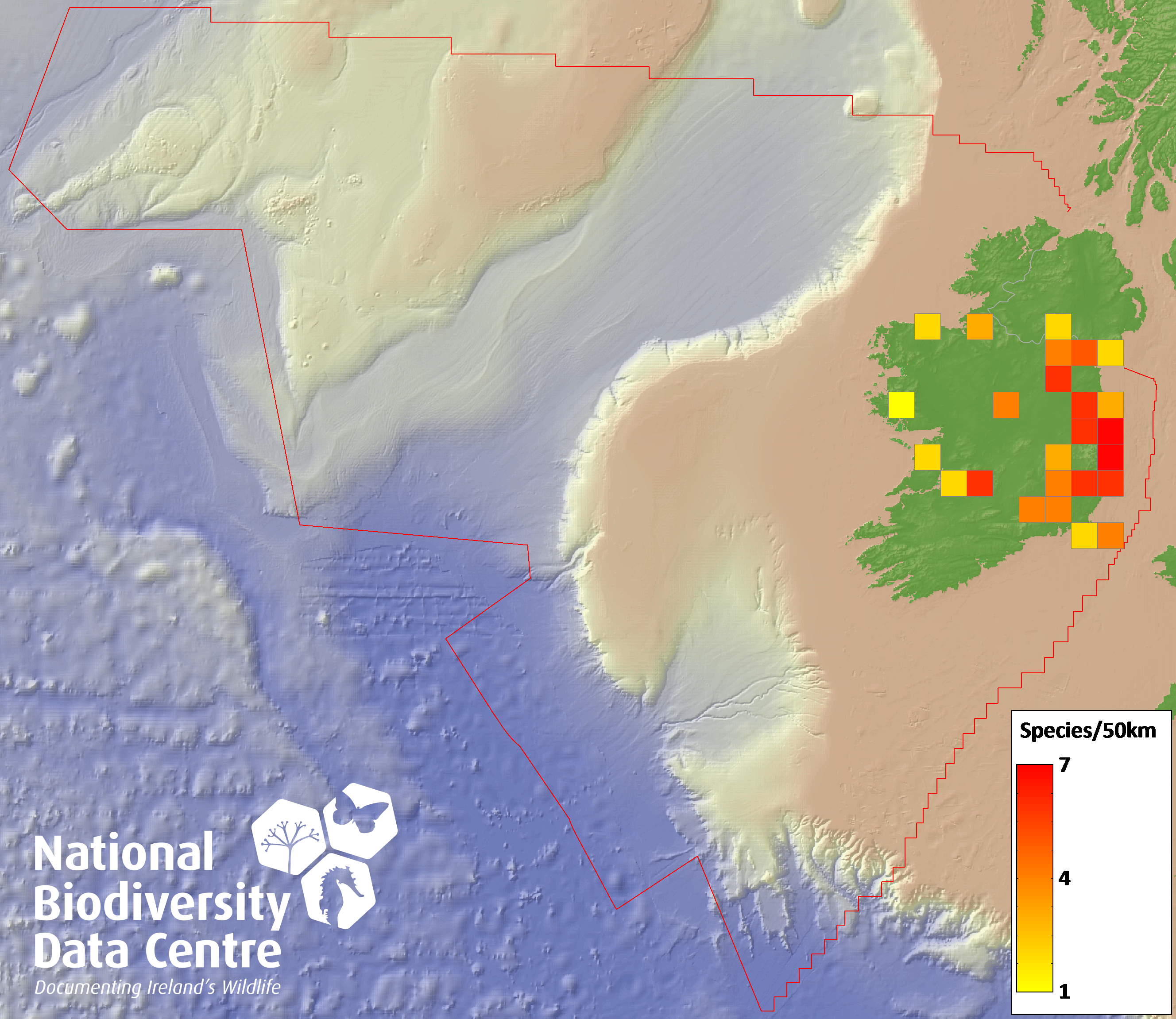 Distribution of the number of species recorded within each 10km grid square (ITM).Marine Map - 50Km