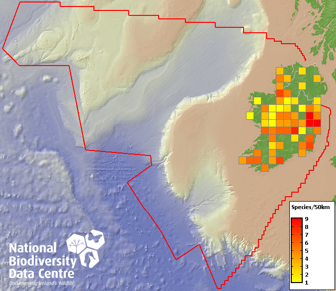 Distribution of the number of species recorded within each 10km grid square (ITM).Marine Map - 50Km