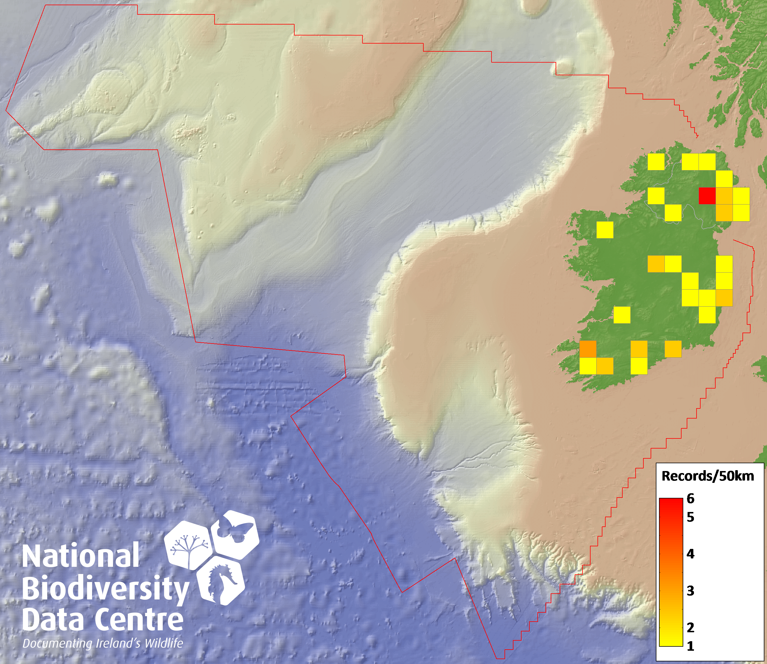 Distribution of the number of records recorded within each 10km grid square (ITM).Marine Map - 50km