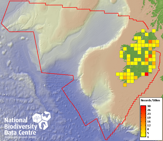 Distribution of the number of records recorded within each 10km grid square (ITM).Marine Map - 50km