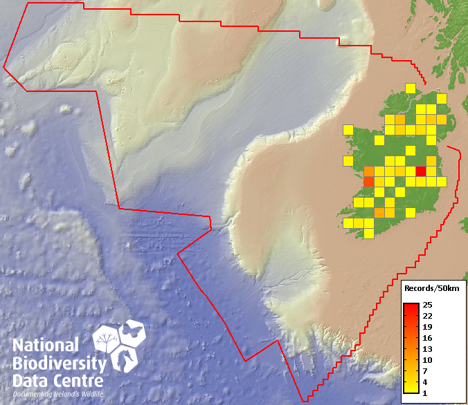 Distribution of the number of records recorded within each 10km grid square (ITM).Marine Map - 50km