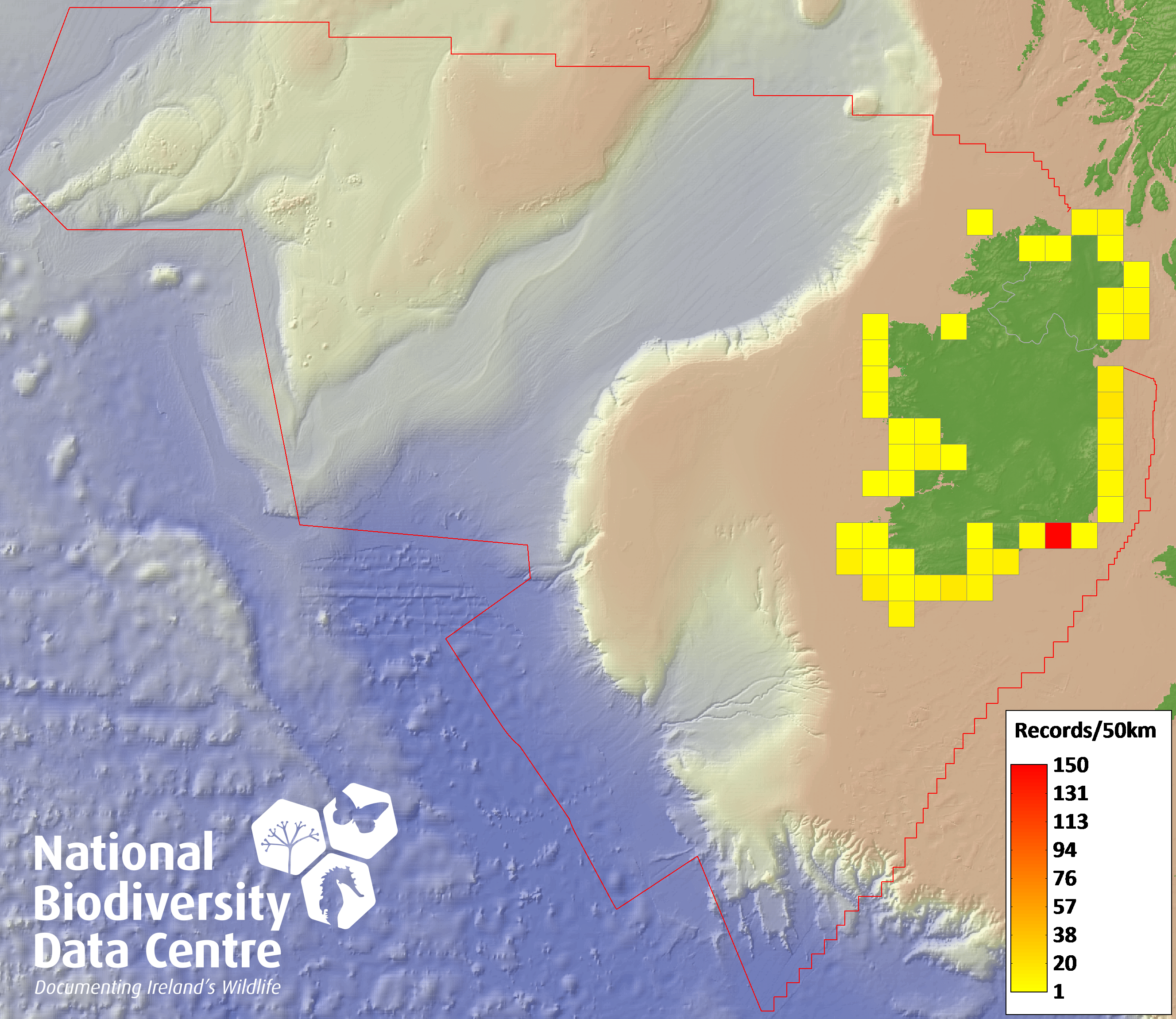 Distribution of the number of records recorded within each 10km grid square (ITM).Marine Map - 50km