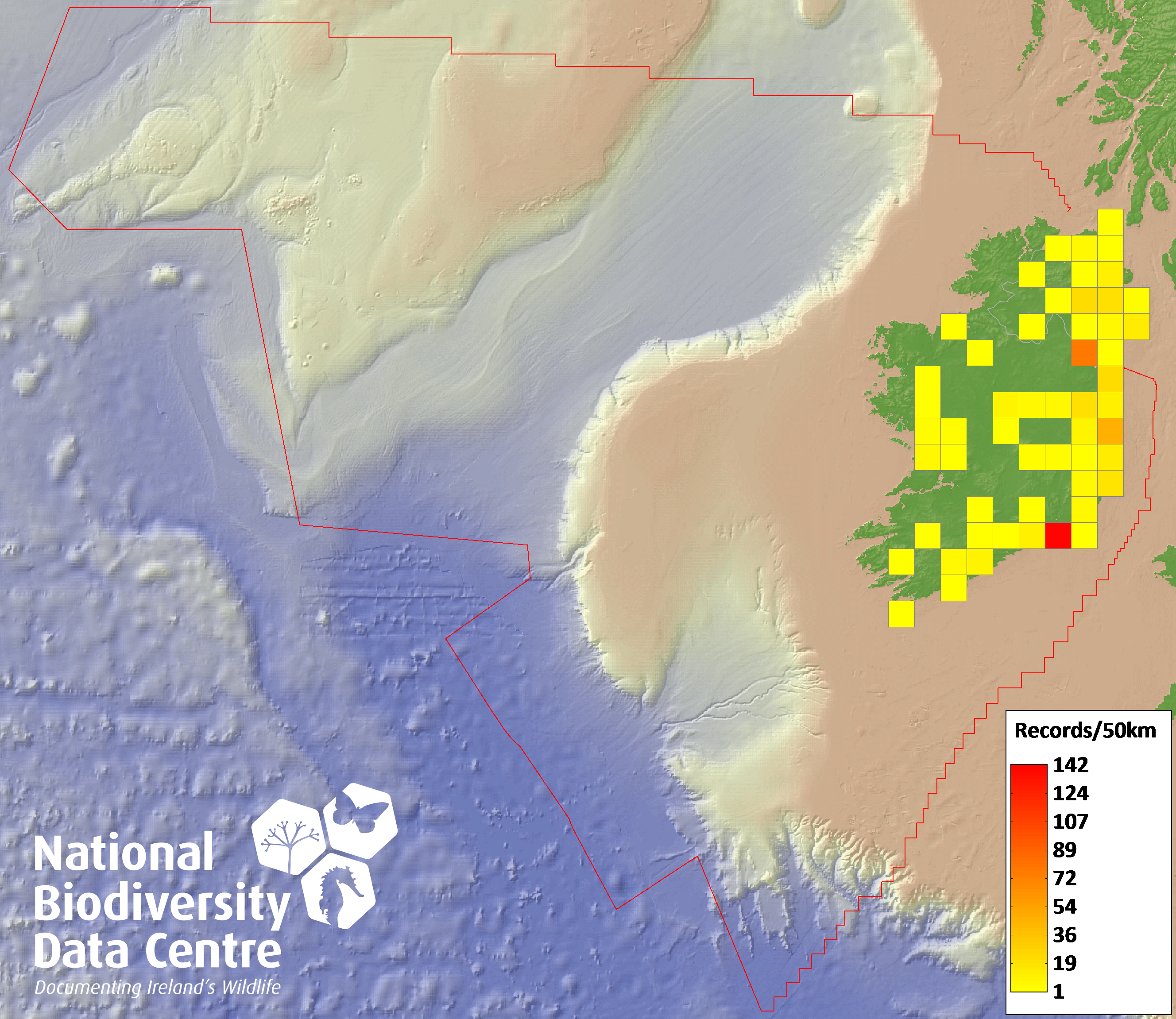 Distribution of the number of records recorded within each 10km grid square (ITM).Marine Map - 50km