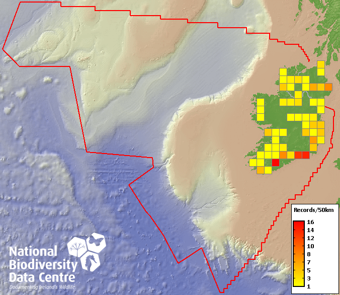 Distribution of the number of records recorded within each 10km grid square (ITM).Marine Map - 50km