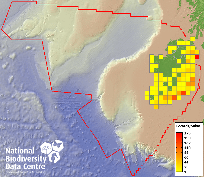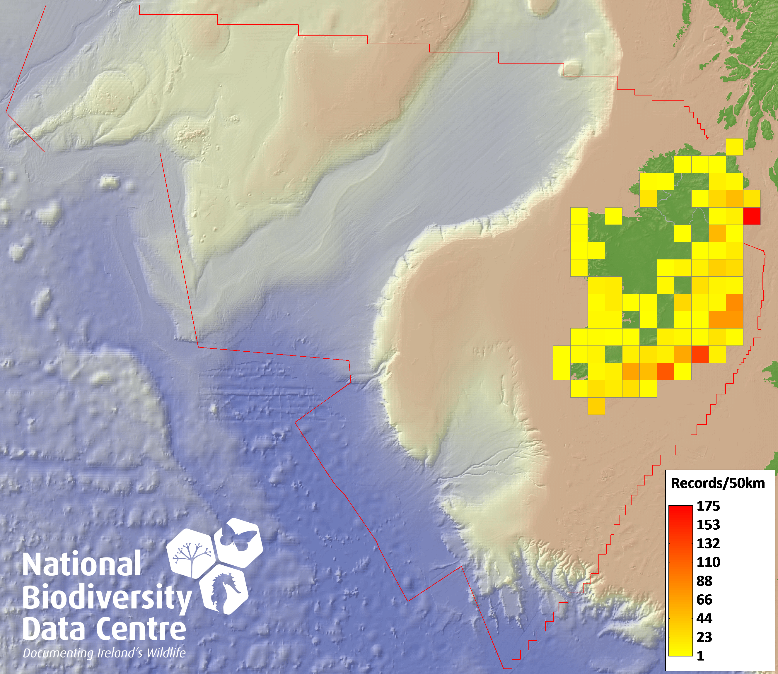 Distribution of the number of records recorded within each 10km grid square (ITM).Marine Map - 50km