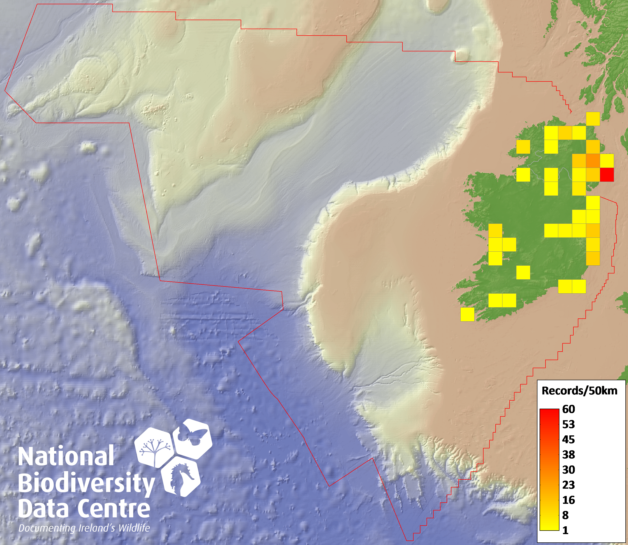 Distribution of the number of records recorded within each 10km grid square (ITM).Marine Map - 50km