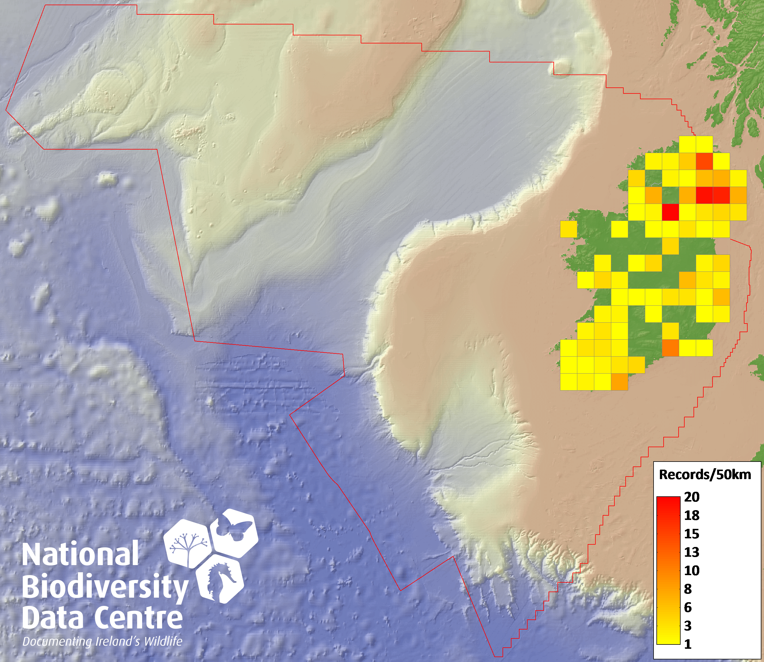 Distribution of the number of records recorded within each 10km grid square (ITM).Marine Map - 50km