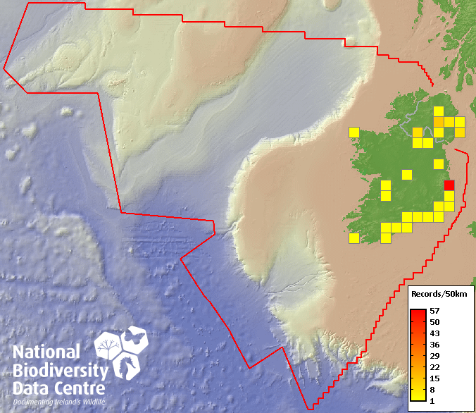 Distribution of the number of records recorded within each 10km grid square (ITM).Marine Map - 50km