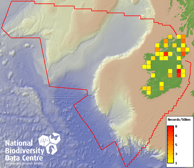 Distribution of the number of records recorded within each 10km grid square (ITM).Marine Map - 50km