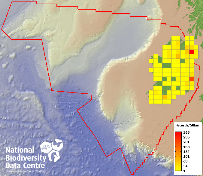 Distribution of the number of records recorded within each 10km grid square (ITM).Marine Map - 50km