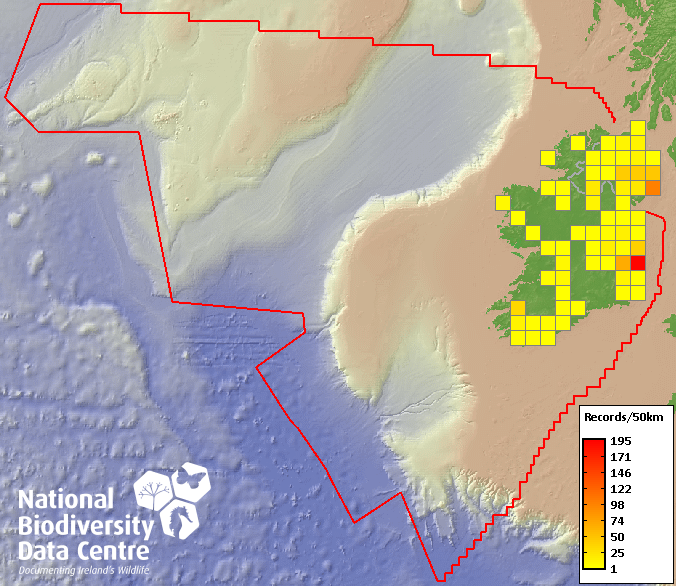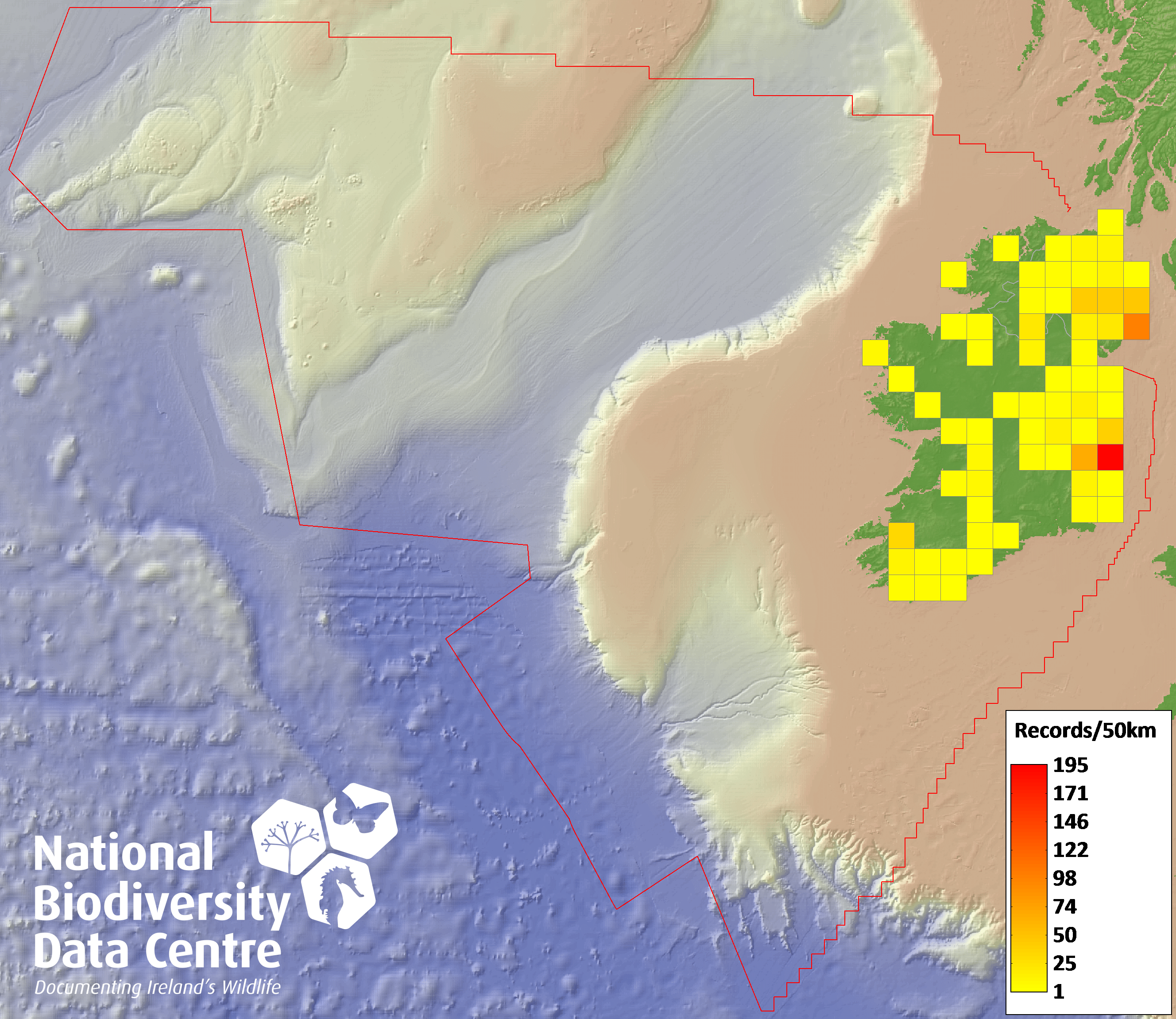 Distribution of the number of records recorded within each 10km grid square (ITM).Marine Map - 50km