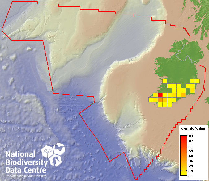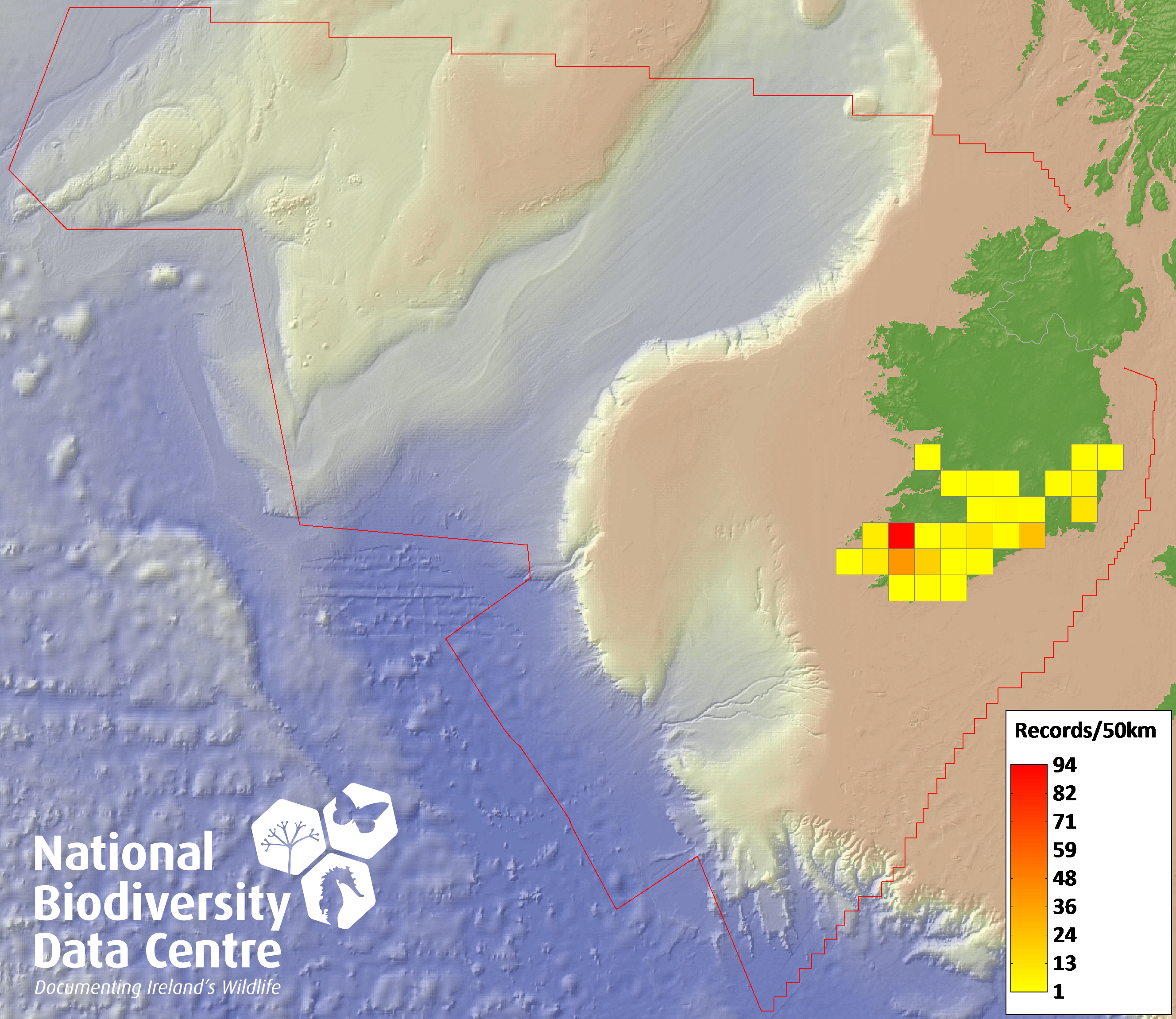 Distribution of the number of records recorded within each 10km grid square (ITM).Marine Map - 50km