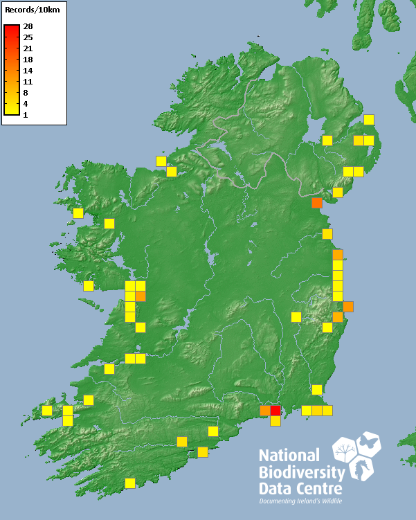 Distribution of the number of records recorded within each 10km grid square (ITM).Marine Map - 50km