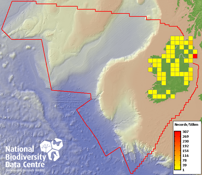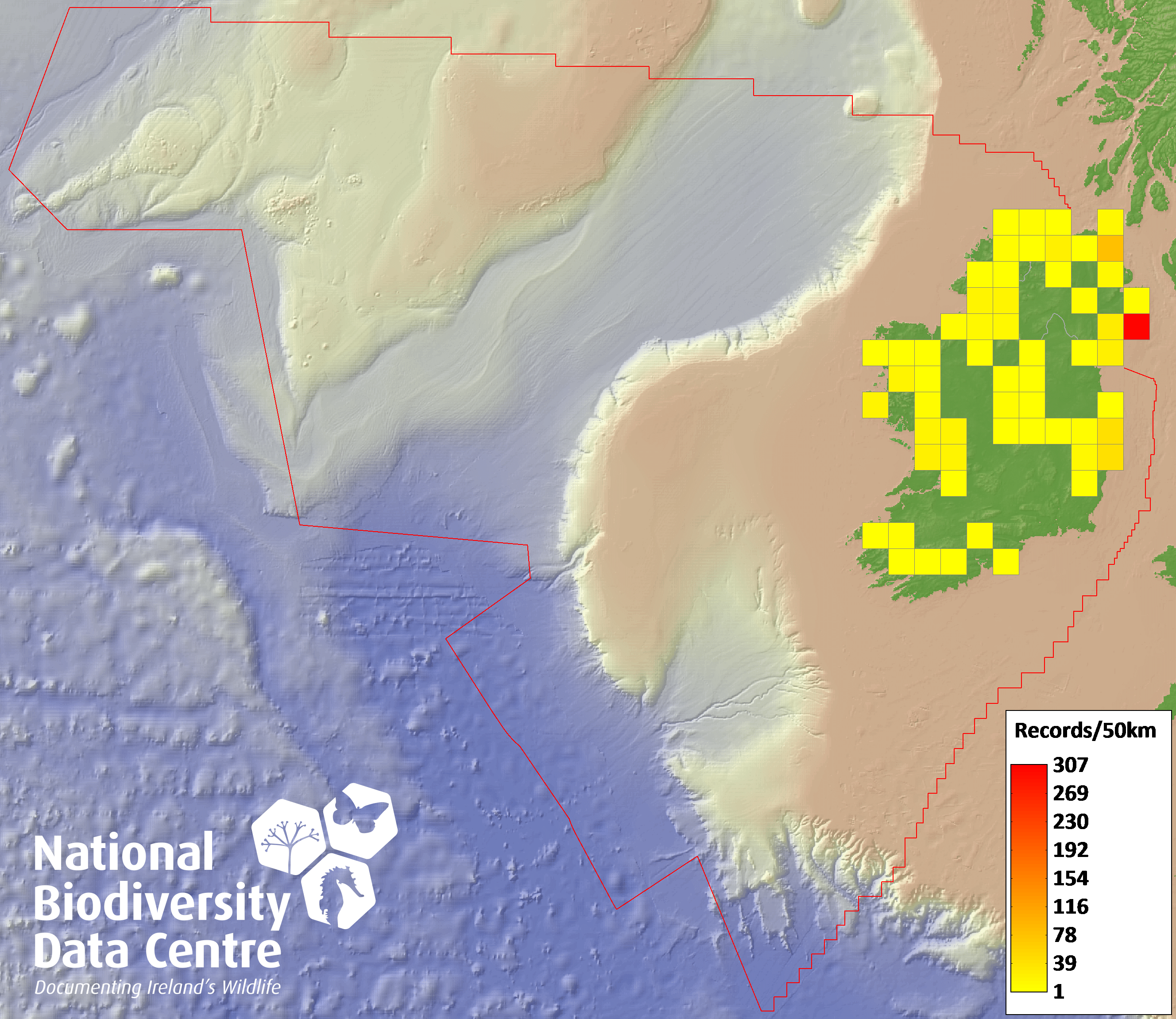 Distribution of the number of records recorded within each 10km grid square (ITM).Marine Map - 50km