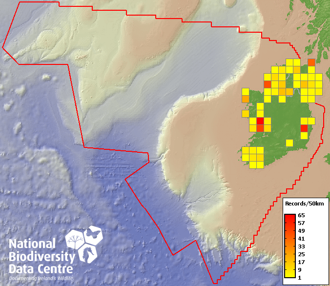 Distribution of the number of records recorded within each 10km grid square (ITM).Marine Map - 50km